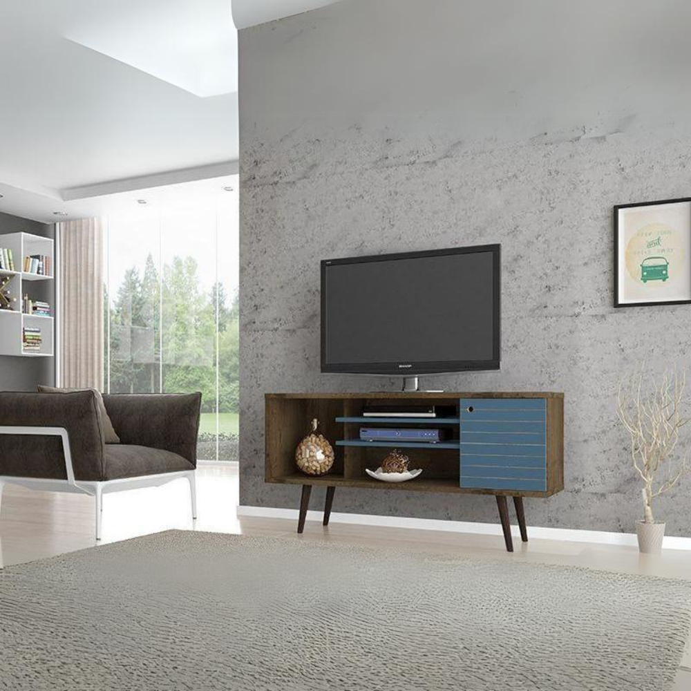 Liberty 53.14" Mid-Century - Modern TV Stand with 5 Shelves and 1 Door in Rustic Brown and Aqua Blue with Solid Wood Legs
