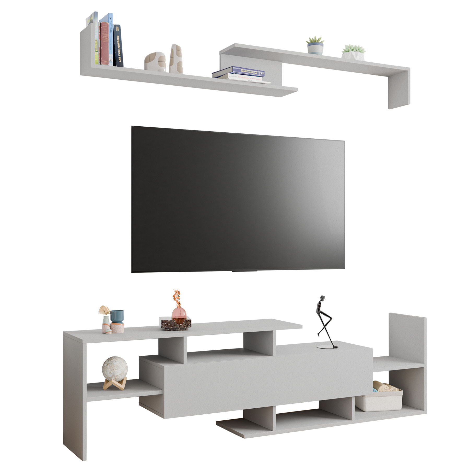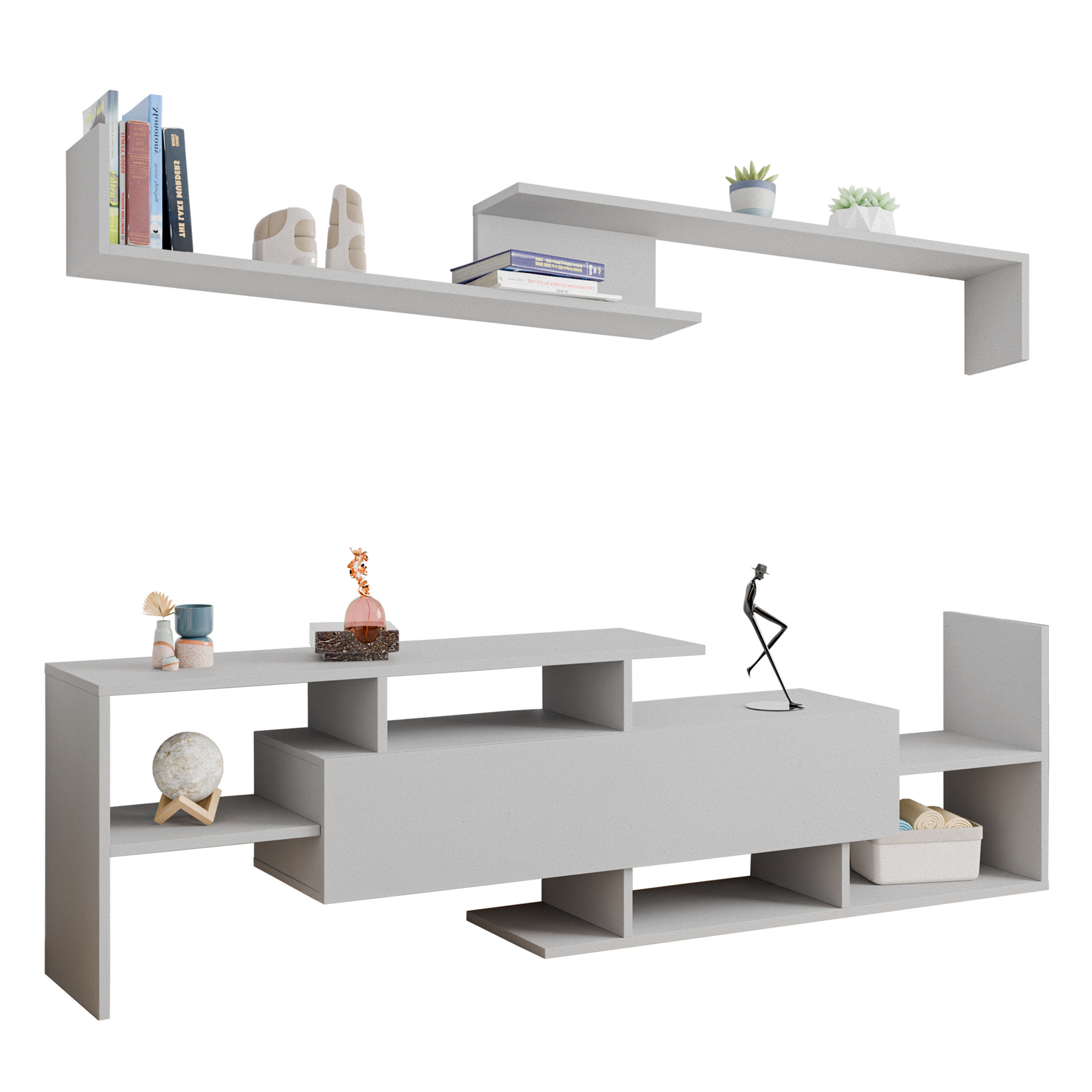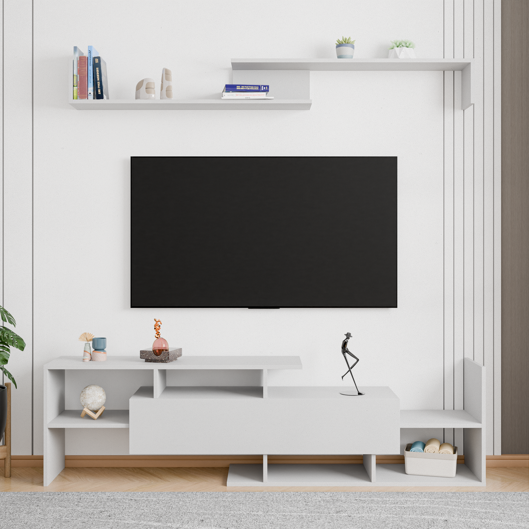 Transform your living space into a stylish and organized hub for entertainment with our versatile TV stand. This furniture piece offers the perfect blend of functionality, design, and storage to elevate your TV viewing experience. From open shelving to enclosed storage, this set has it all, and it's designed to seamlessly integrate into your living room, ensuring your entertainment essentials are within arm's reach. The TV stand features open shelving that provides ample space for showcasing your favorite books, decor, and media components. Whether you want to display your collection of novels, family photos, or your impressive Blu-ray and gaming console collection. Personalize your entertainment area by selecting from a range of finishes that match your home decor. Whether you prefer a classic wood finish for a timeless look, a sleek black for a modern touch, or a chic white to brighten your space, our combo is available in various finishes to suit your unique style. Don't miss the opportunity to transform your entertainment area with our elegant TV stand. Its spacious shelving, enclosed storage, and easy maintenance make it a valuable addition to your home.