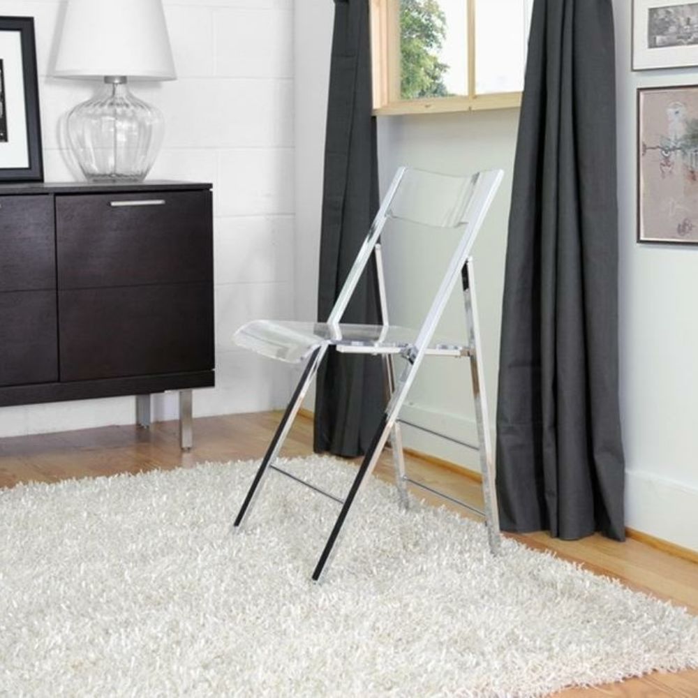 Acrylic folding chair constructed of chromed steel, ergonomically sculpted back, rubber feet to prevent scratching wood floors, foldable for easy storage.