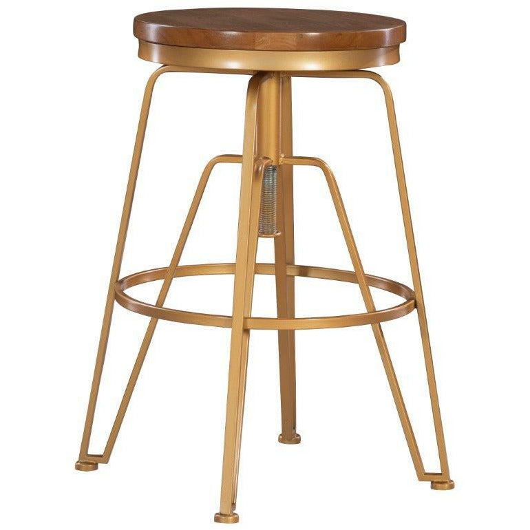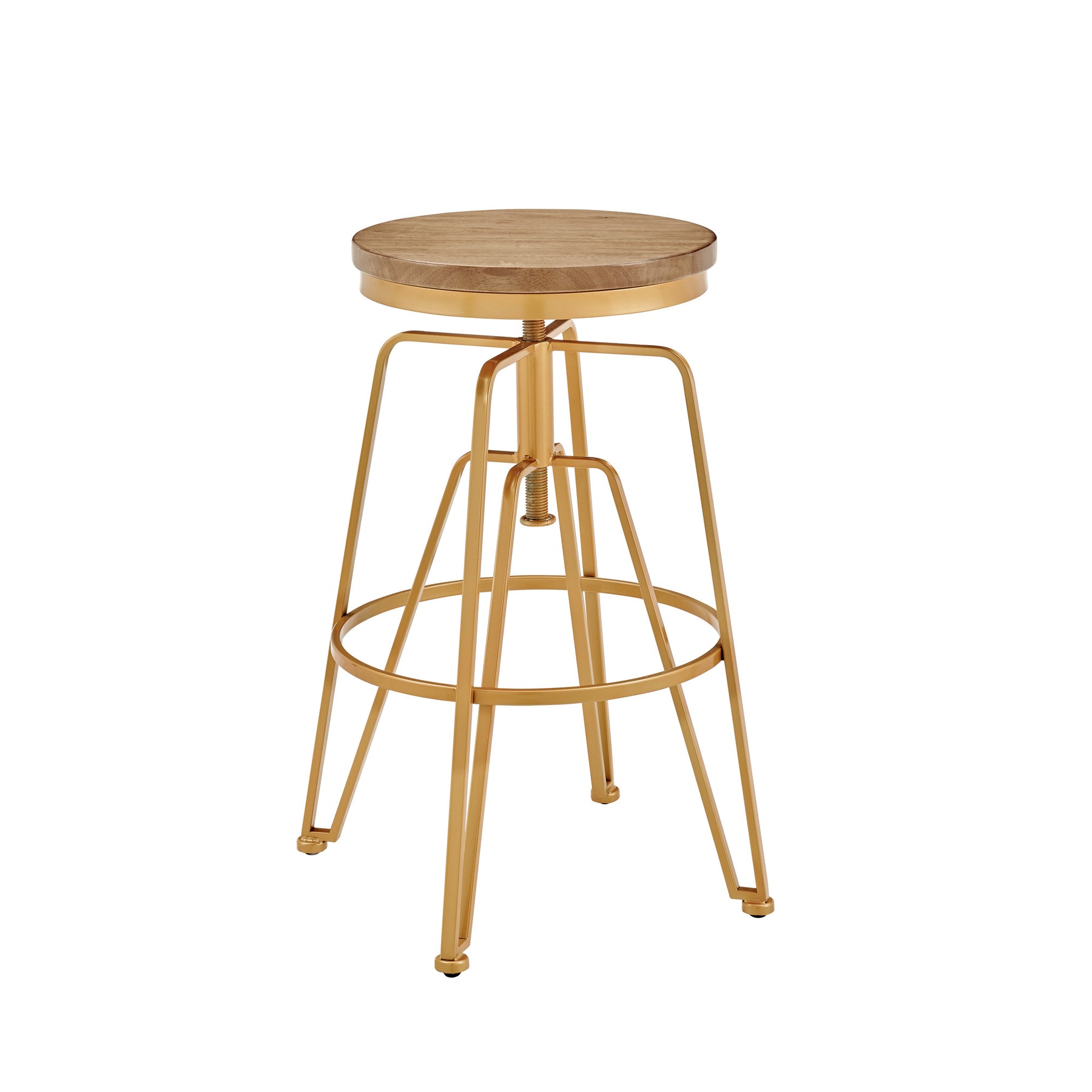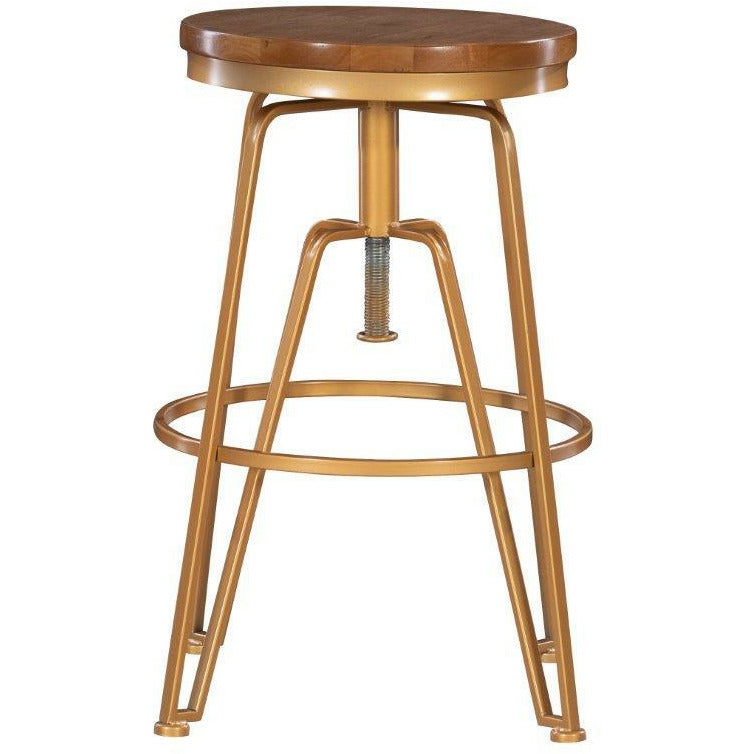 The Wood and Metal Adjustable Stool is perfect for adding transitional styled seating to a pub table or counter. The wood top and matte gold iron base easily complements a variety of décor schemes from modern to farmhouse. Spin the wood top and the stool easily adjusts from 25" to 29". The bottom foot railing aids in the sturdiness and durability of the piece.