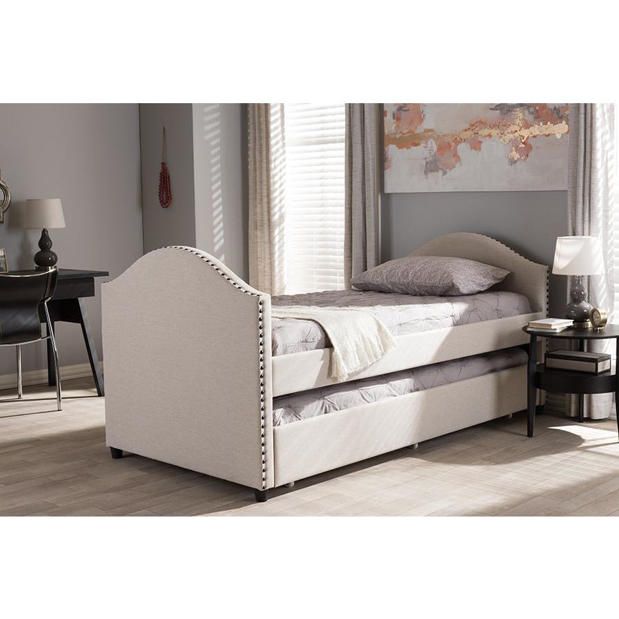 Relax and enjoy time from a hectic schedule with this Alessia beige fabric upholstered daybed with guest trundle bed. Created with hardwood, plywood and engineered wood, this lovely daybed is great for your living room, guest room or your home office. Upholstered in neutral beige polyester fabric and padded with high density foam, the Alessia daybed features camel-shaped armrests with bronze nail heads trim. The wheeled trundle guest bed provides an additional sleeping space for your guest to stay overnight. Offering a number of different styling solutions, this versatile 3-in-1 furniture multitasks as a daybed, sofa and guest bed. For studio apartment and condominium where space is limited, the Alessia could be your reading nook during the day time while transforming into your guest bed for two by rolling out the trundle. In your living room, family room or home office, the daybed is a good option for extra seating space during day time while transforming into guest bed for two at night. Made in Malaysia, the daybed requires assembly.