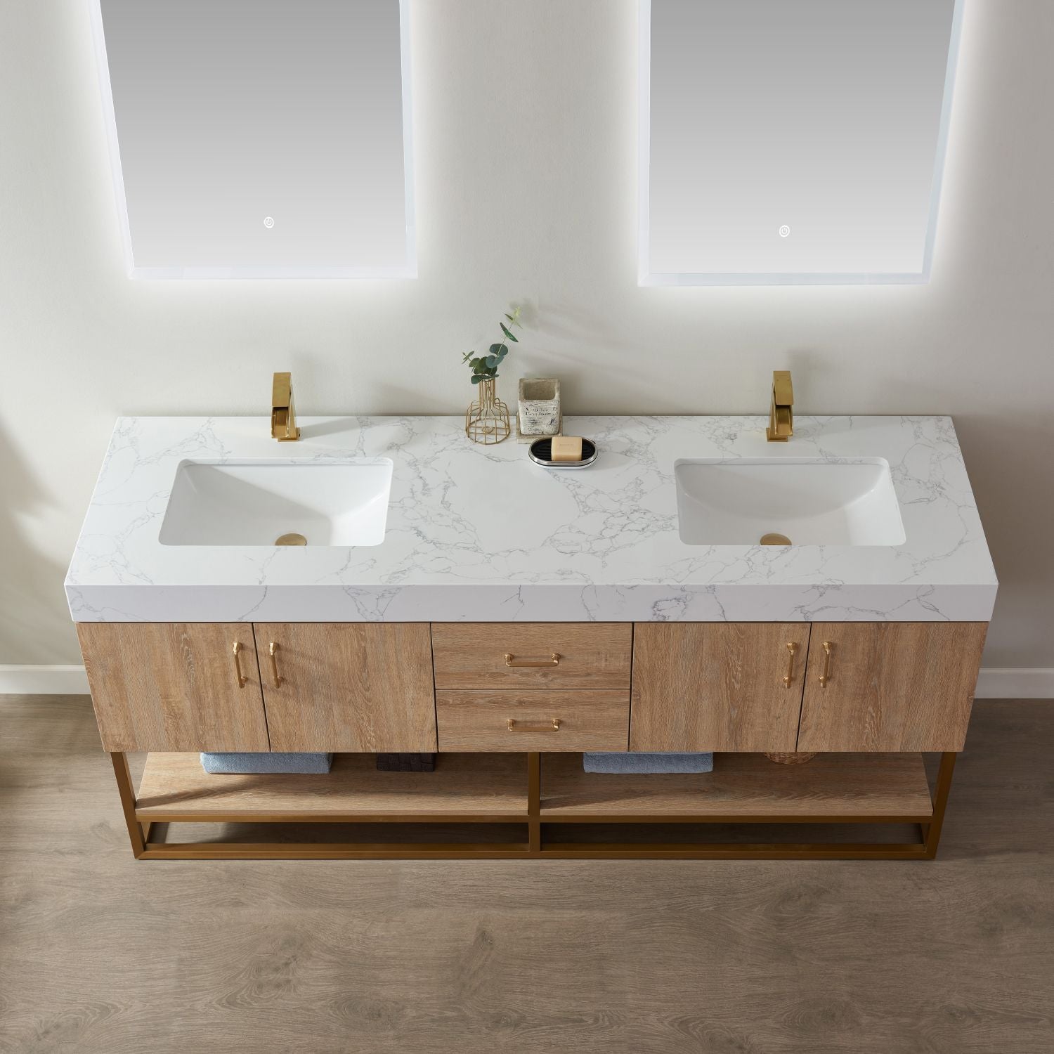 Alistair will add elegance and head-turning style to your modern bathroom space, accompanied with LED mirror duo. It combines the warmth of an earthy Plywood and Crafted PVC board cabinet with a vibrant white stone for a contemporary finish. The vanity is adorned with brushed gold or Matte Black hardware for a true opulent finish.