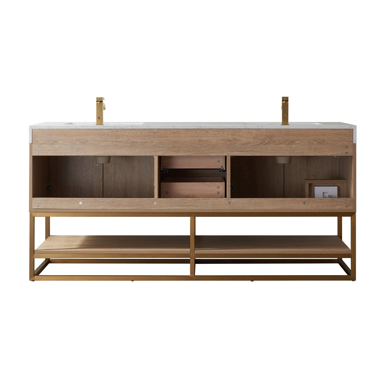 Alistair 72" Double Vanity in North American Oak with White Grain Stone Countertop With Mirror