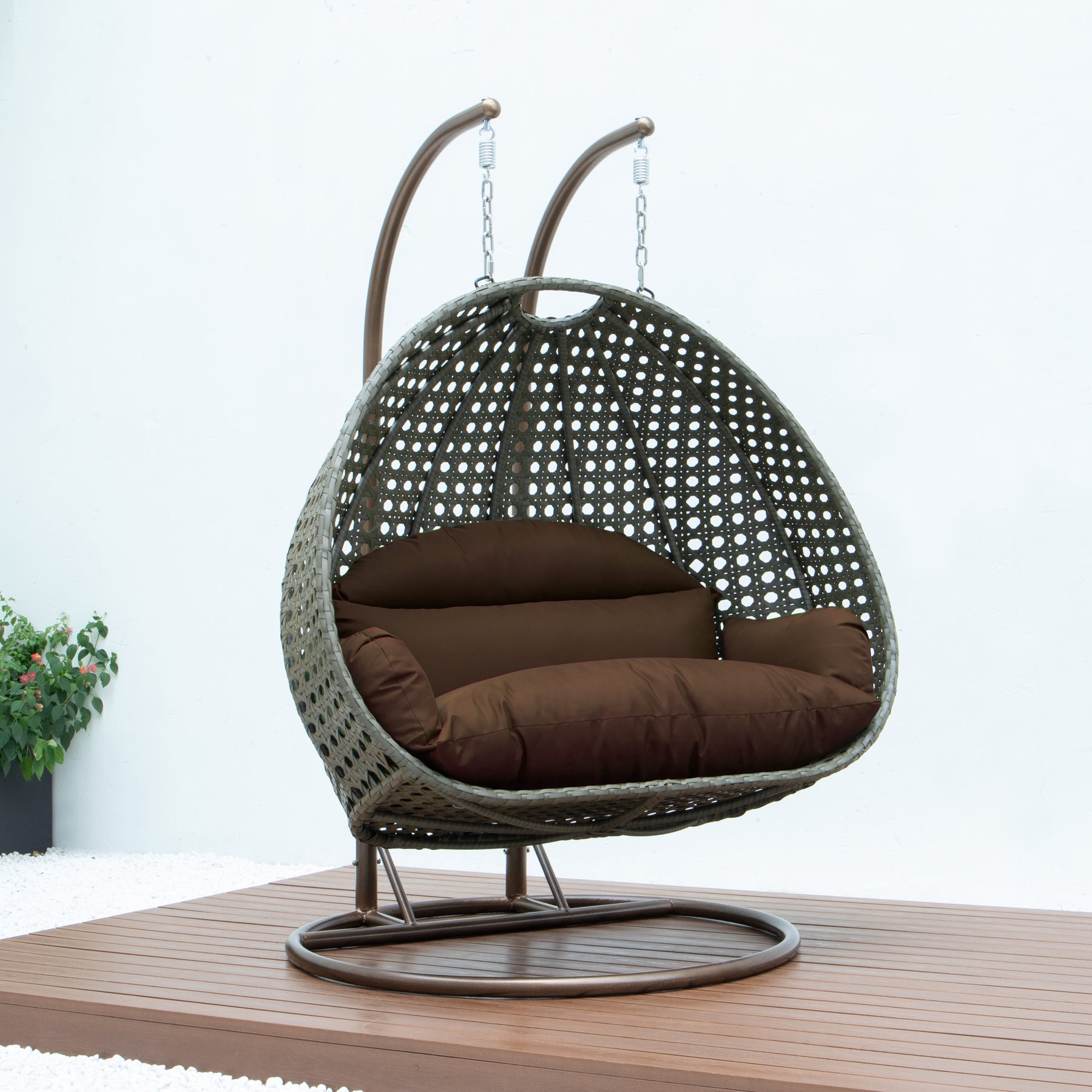 - Experience unparalleled comfort with our egg-shaped two-person seat swing chair set, perfect for indoor and outdoor furniture relaxation. Its unique design merges elegance with coziness, reinforced by double chain hooks and a sturdy metal stand for unwavering stability. Enhanced by a wicker frame and paired with a soft seat cushion, it provides the perfect setting for intimate conversations.