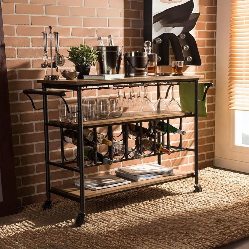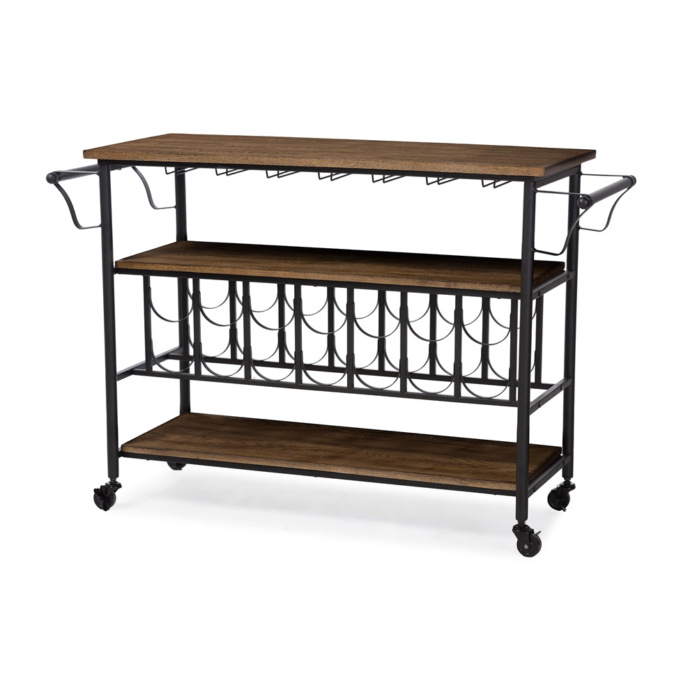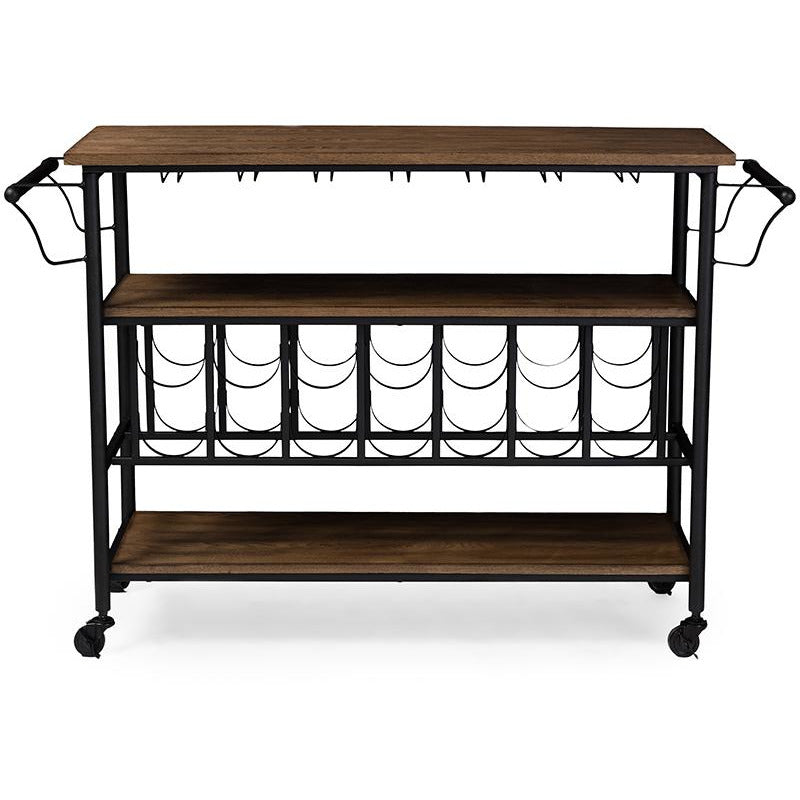 Featuring rustic reclaimed look, the Bradford mobile kitchen bar serving wine cart is constructed of antique black textured finish metal frame and distressed weathered oak finished plank wood board. This wood and metal rolling cart has that vintage feel you crave with 2 open shelves for extra storage! Hanging glass racks is built in for easy maintenance while the built-in wine racks providing space for wine bottle storage. To add functionality, the cart is built in with towel holders on two sides. Constructed of sturdy metal frame in antiqued bronze finishing with MDF and distressed ash veneer, the Bradford mobile wine cart features great design and functionality. The Bradford bar cart, mounted on wheels with locking breaks, makes a fantastic addition to any home bar, kitchen or entertainment area. Made in China, the mobile serving cart requires assembly and will be delivered in flat pack.