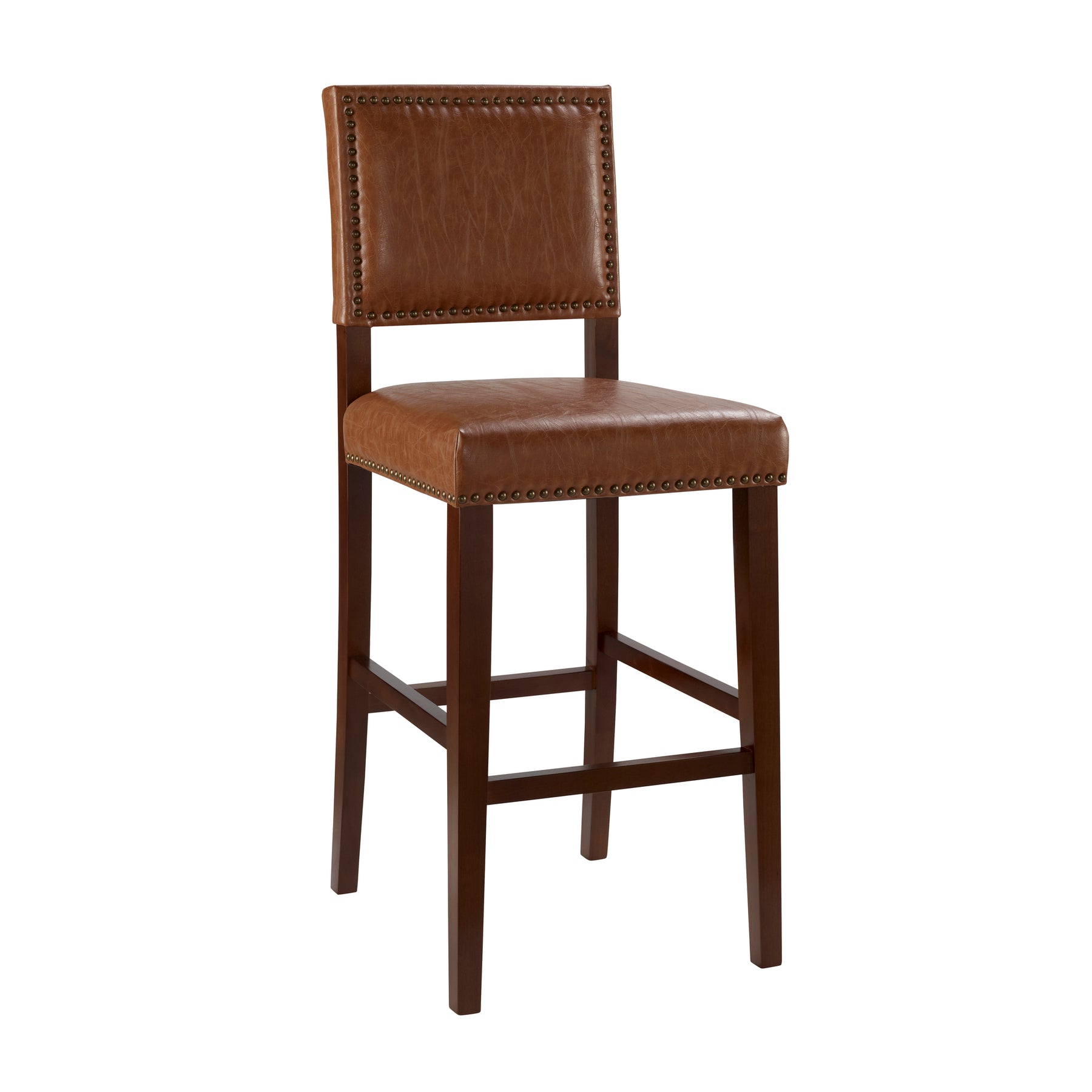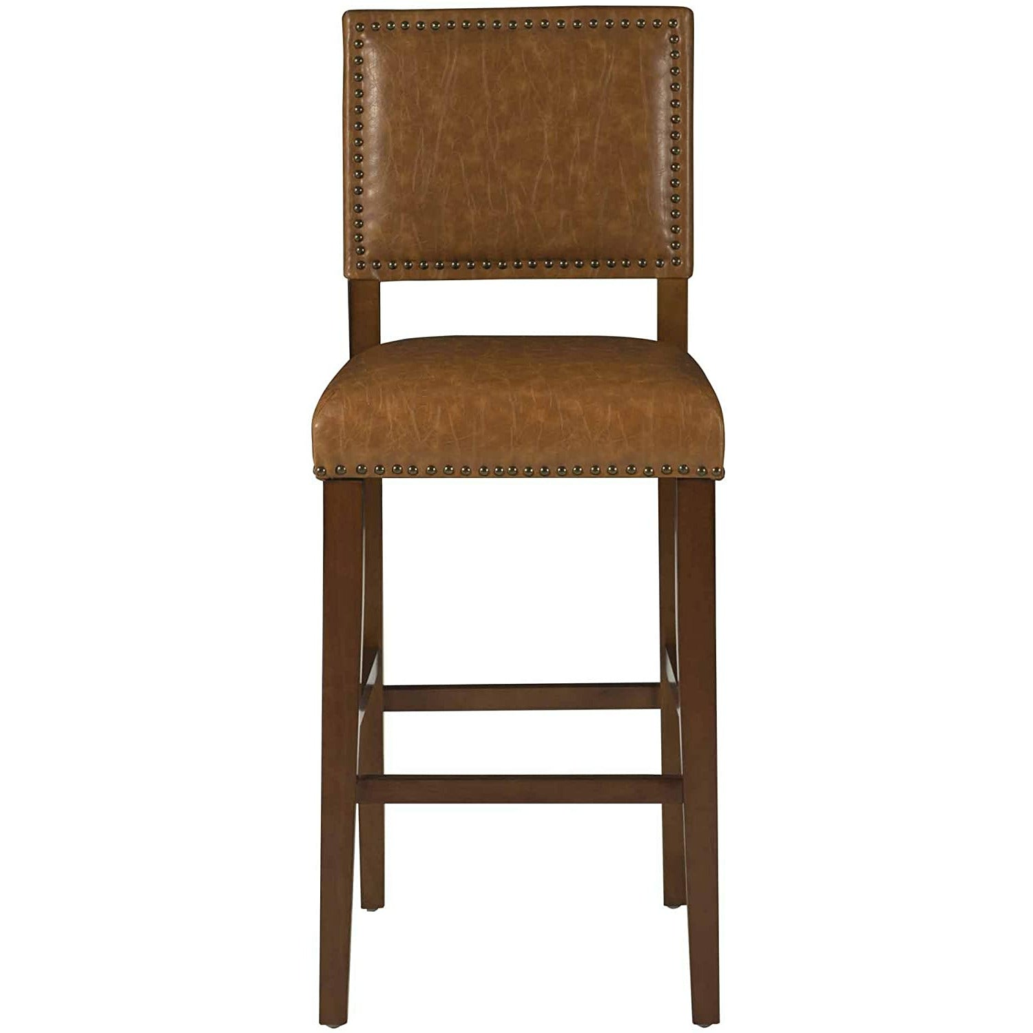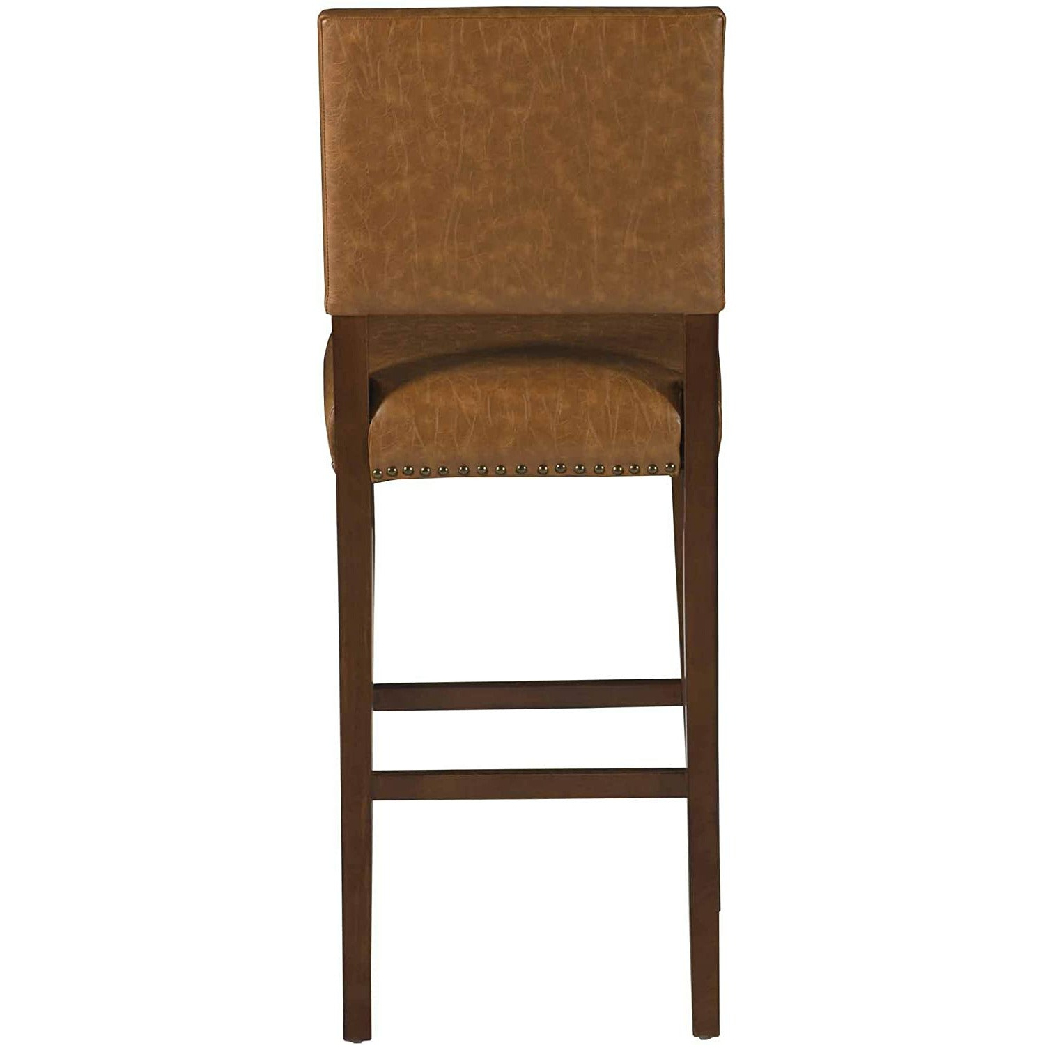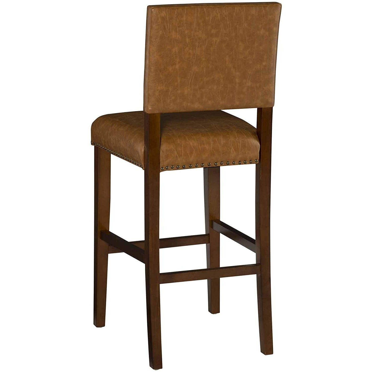 Create a contemporary or classical look in your kitchen, dining or home pub area with the sleek shape and style of this medium walnut finish 30" Brook Counter Stool. Solid wood legs give this courtly stool additional strength ensuring years of everyday use. The padded cushion and seat back provides optimum comfort for you and your guests and is topped with durable caramel colored vinyl that is stain resistant, fade resistant and features tightly woven threads that won't break, mat or peel. Classic nail head trim accents the stools lines. 275 pound weight limit.
