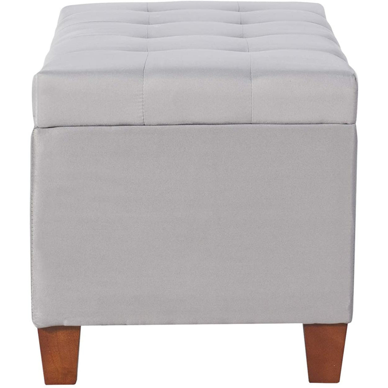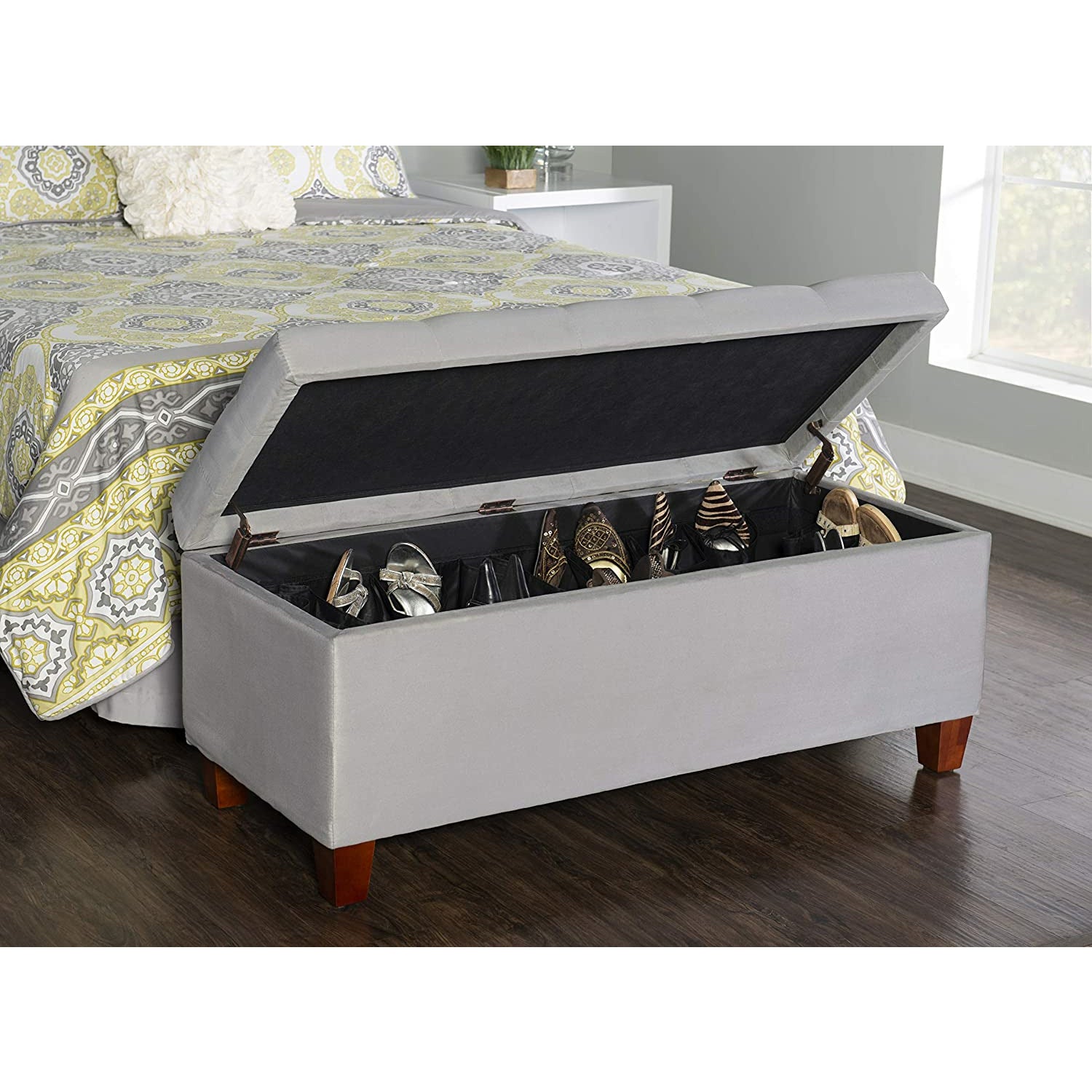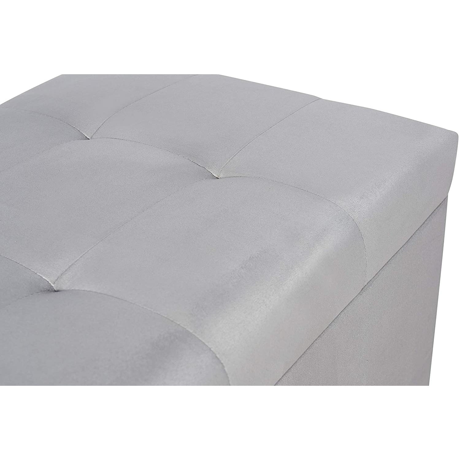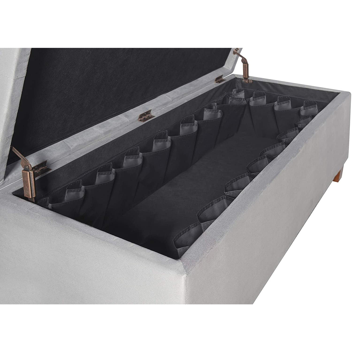 The Carmen Grey Shoe Storage Ottoman is perfect for placing in a large closet, entry or at the foot of a bed. The grey microfiber upholstery allows this piece to easily complement any décor style and color scheme. The top tufting details adds an eye-catching accent to the piece. Once opened, ample interior storage space is revealed. Side pockets are perfect for storing a multitude of shoes, while the open center provides space for other items. A plush cushioned top makes this piece perfect for sitting.