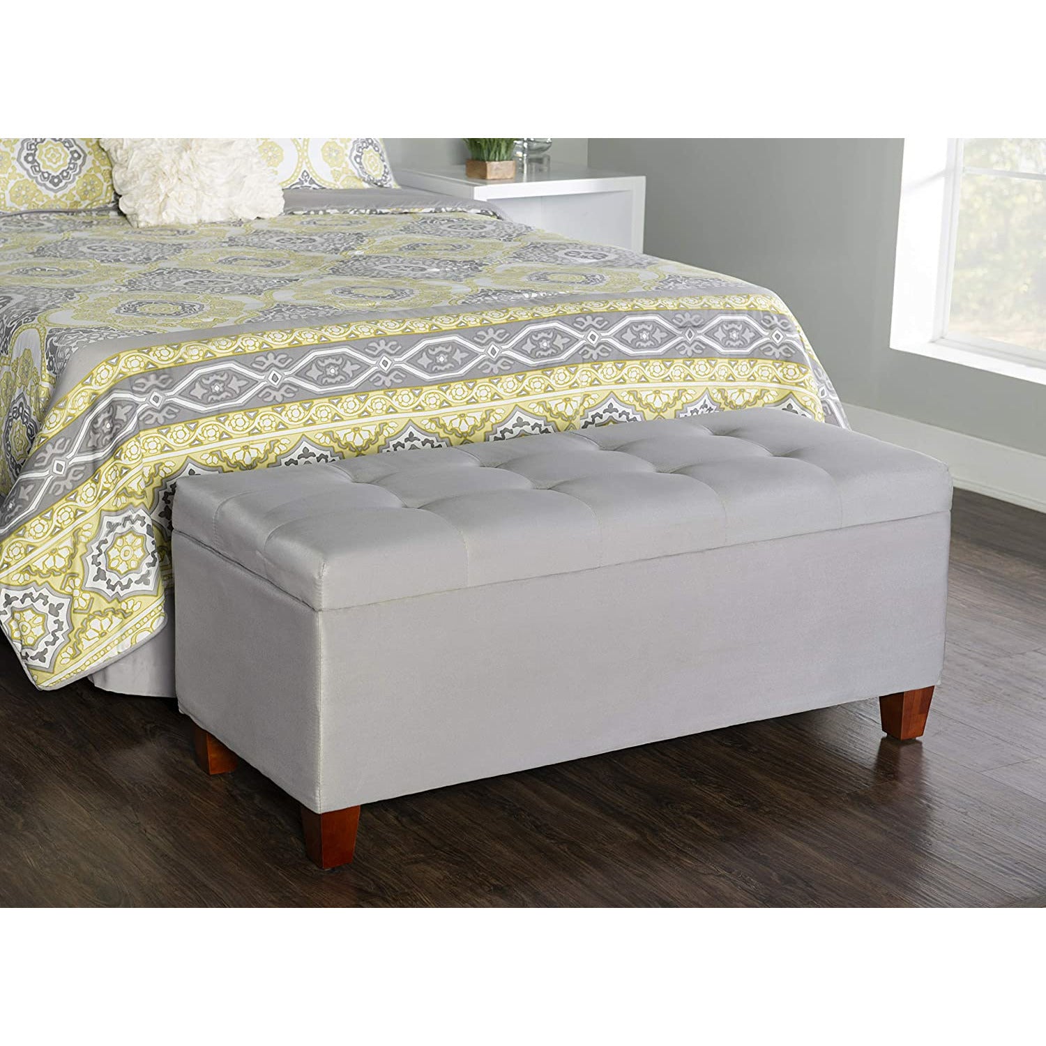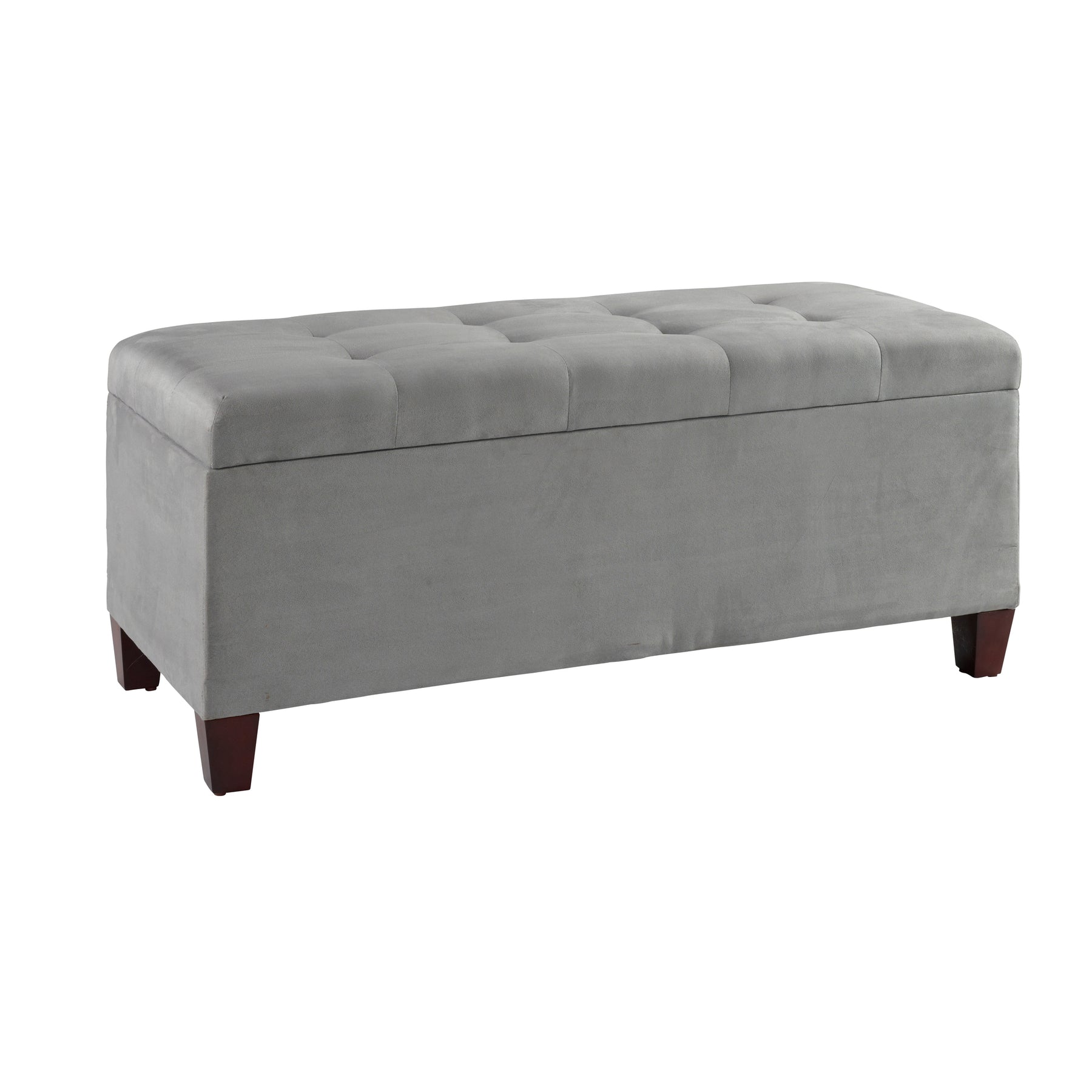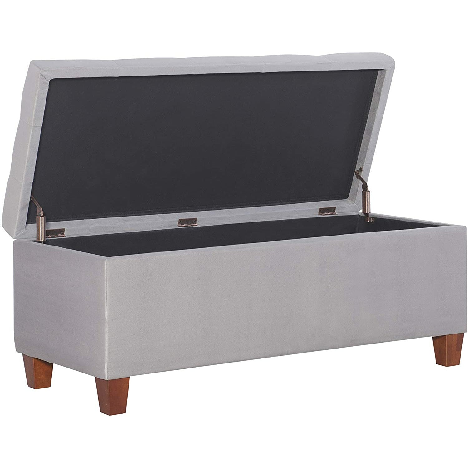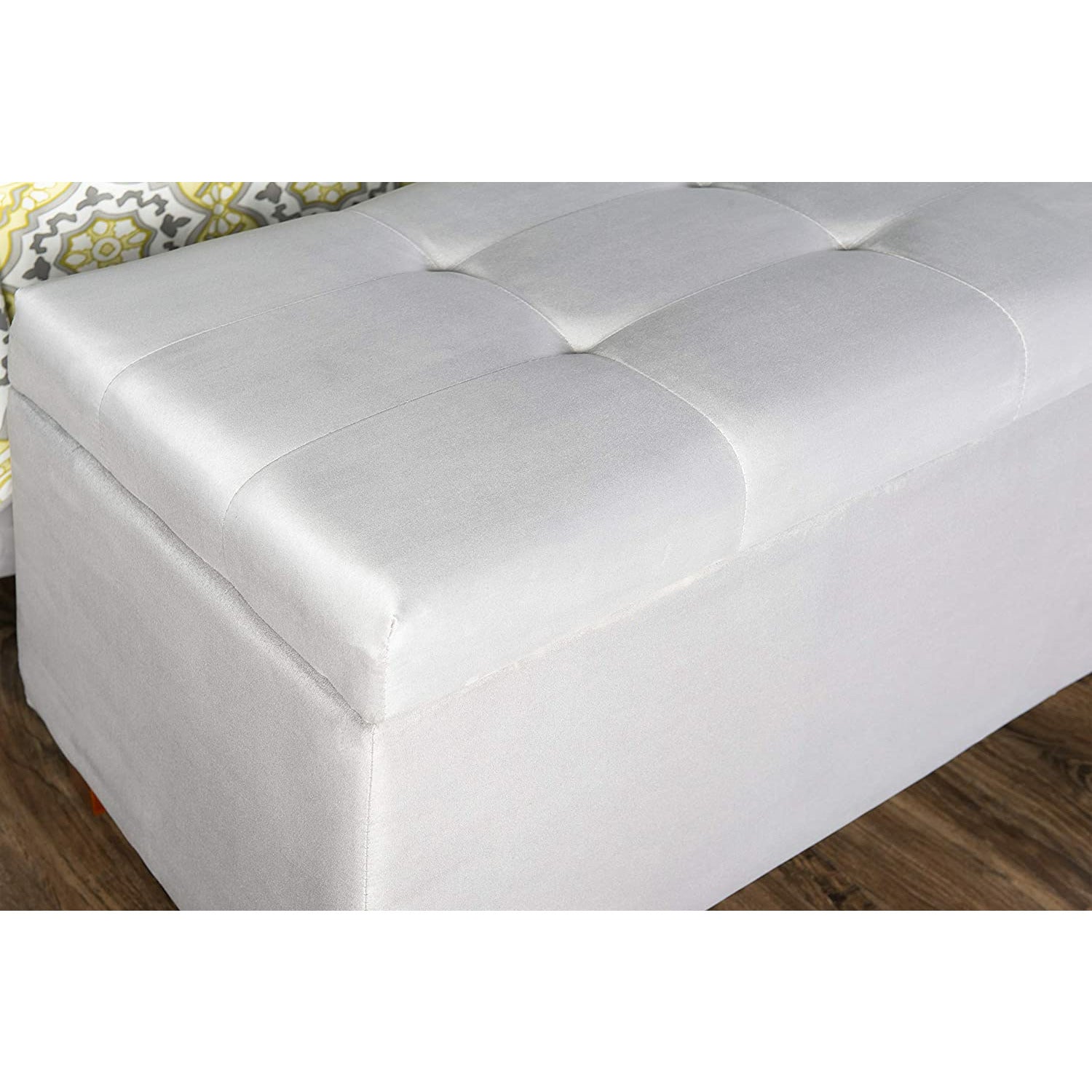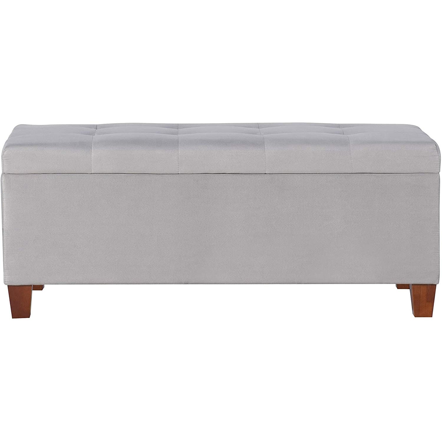 The Carmen Grey Shoe Storage Ottoman is perfect for placing in a large closet, entry or at the foot of a bed. The grey microfiber upholstery allows this piece to easily complement any décor style and color scheme. The top tufting details adds an eye-catching accent to the piece. Once opened, ample interior storage space is revealed. Side pockets are perfect for storing a multitude of shoes, while the open center provides space for other items. A plush cushioned top makes this piece perfect for sitting.
