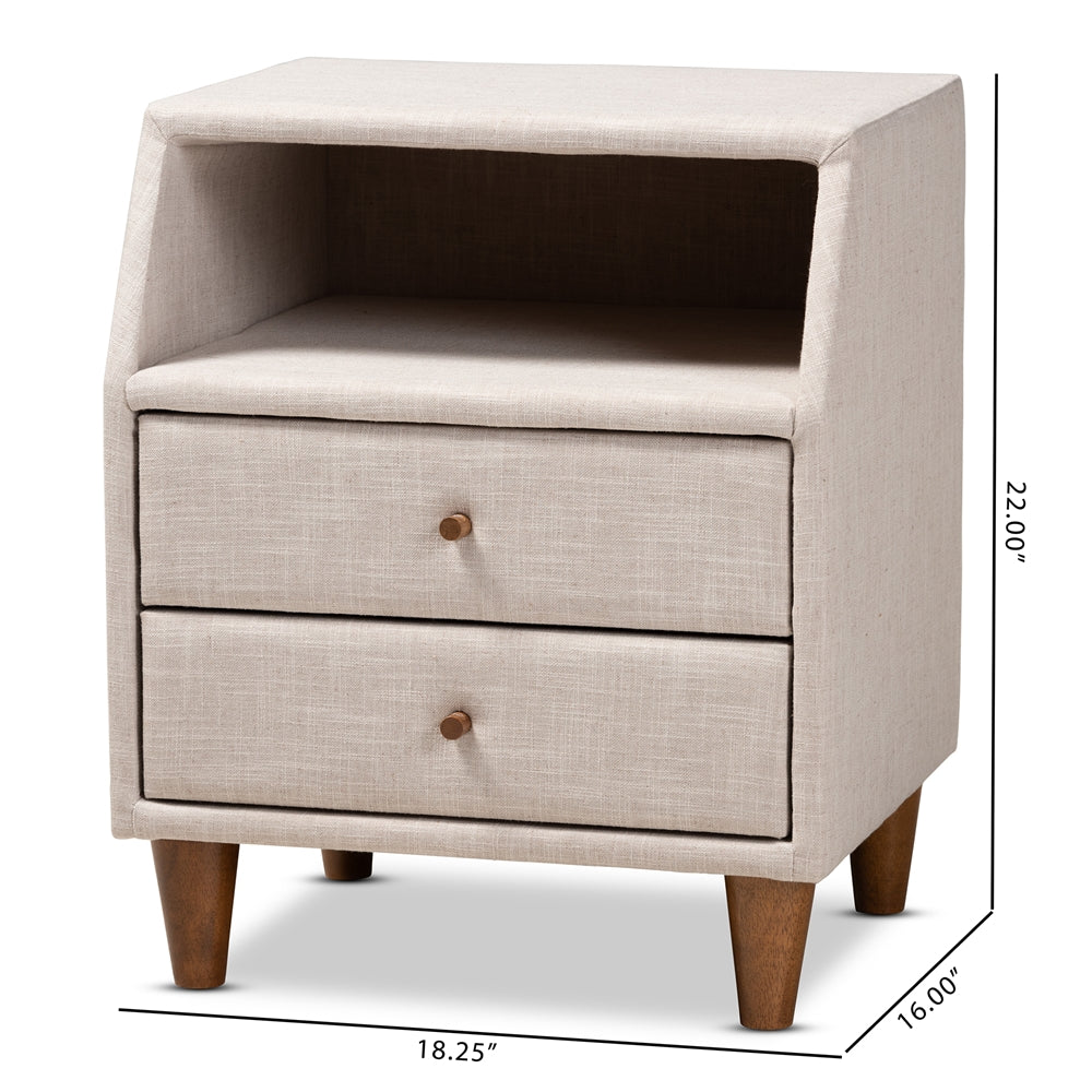 Claverie Mid-Century Modern Beige Fabric Upholstered 2-Drawer Wood Nightstand