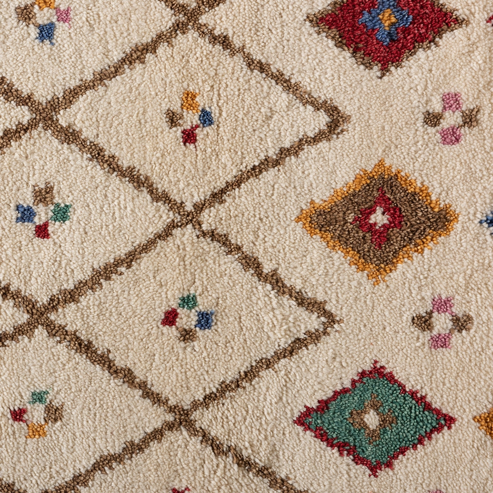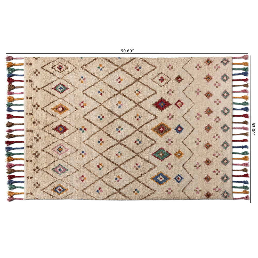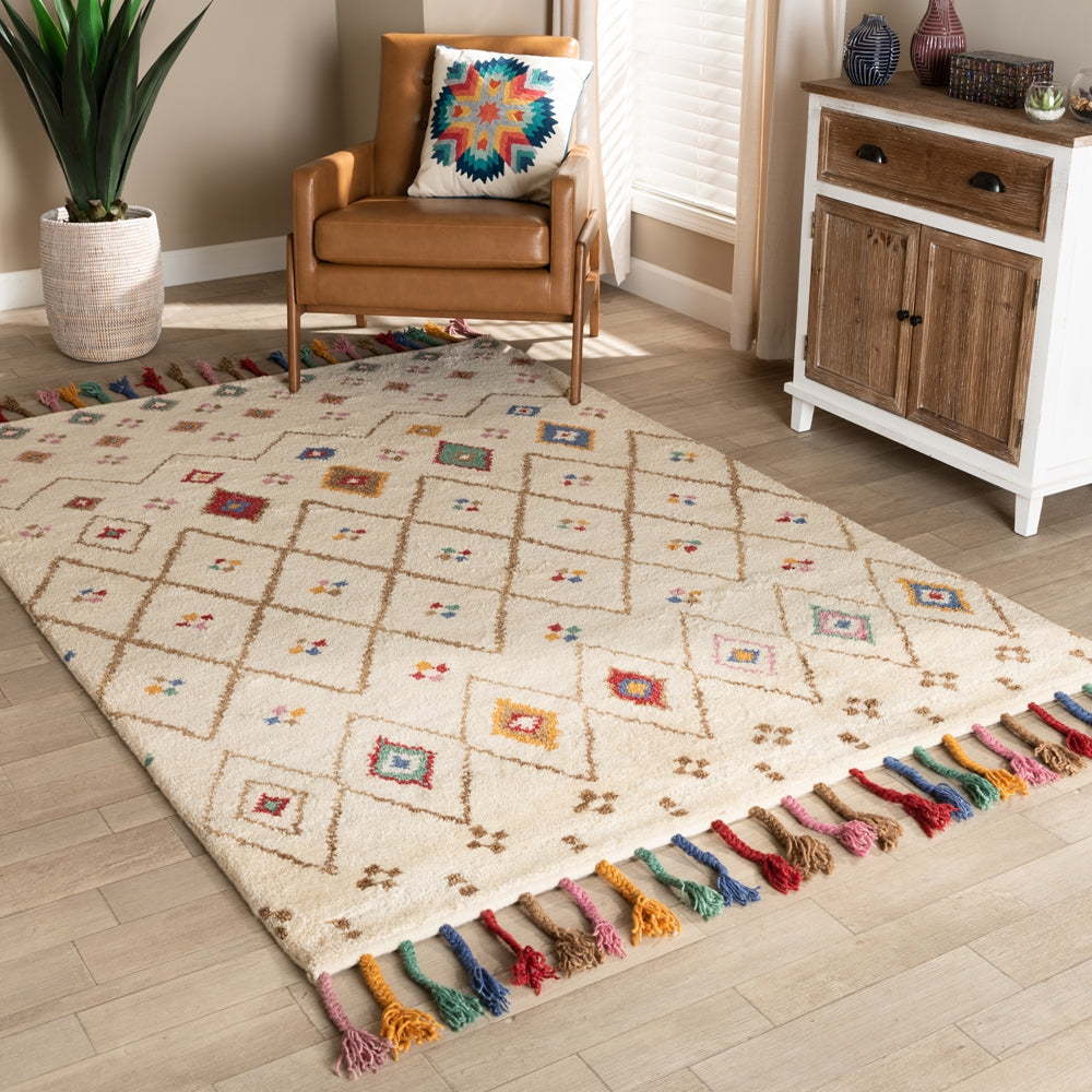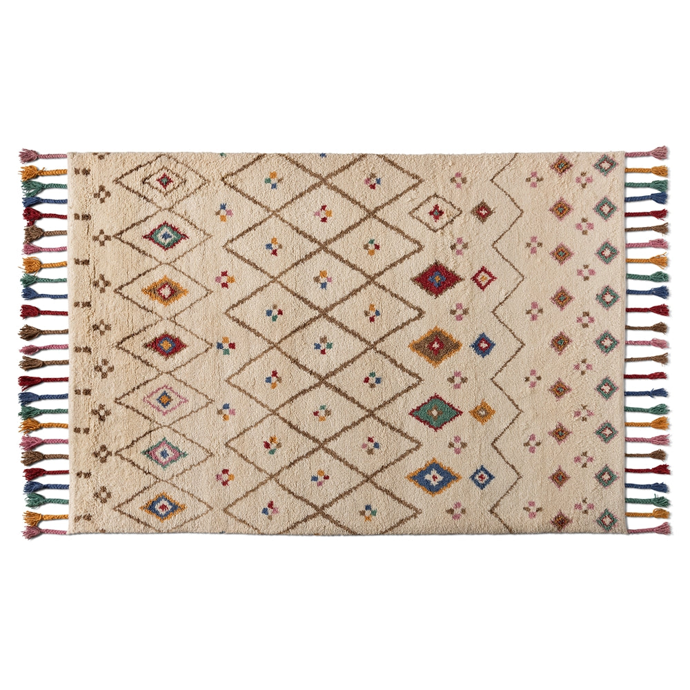 Transform the mood of simple rooms with the exciting personality of the Cremono rug. Hand tufted in India, this rug is comprised of wool. The beige base is adorned with a wide range of colors for a vibrant design that grabs the attention of guests. Clean angles form a striking diamond pattern, while colored tassels add visual flair. An astonishing piece in any space, the Cremono rug is a radiant addition to the modern home.