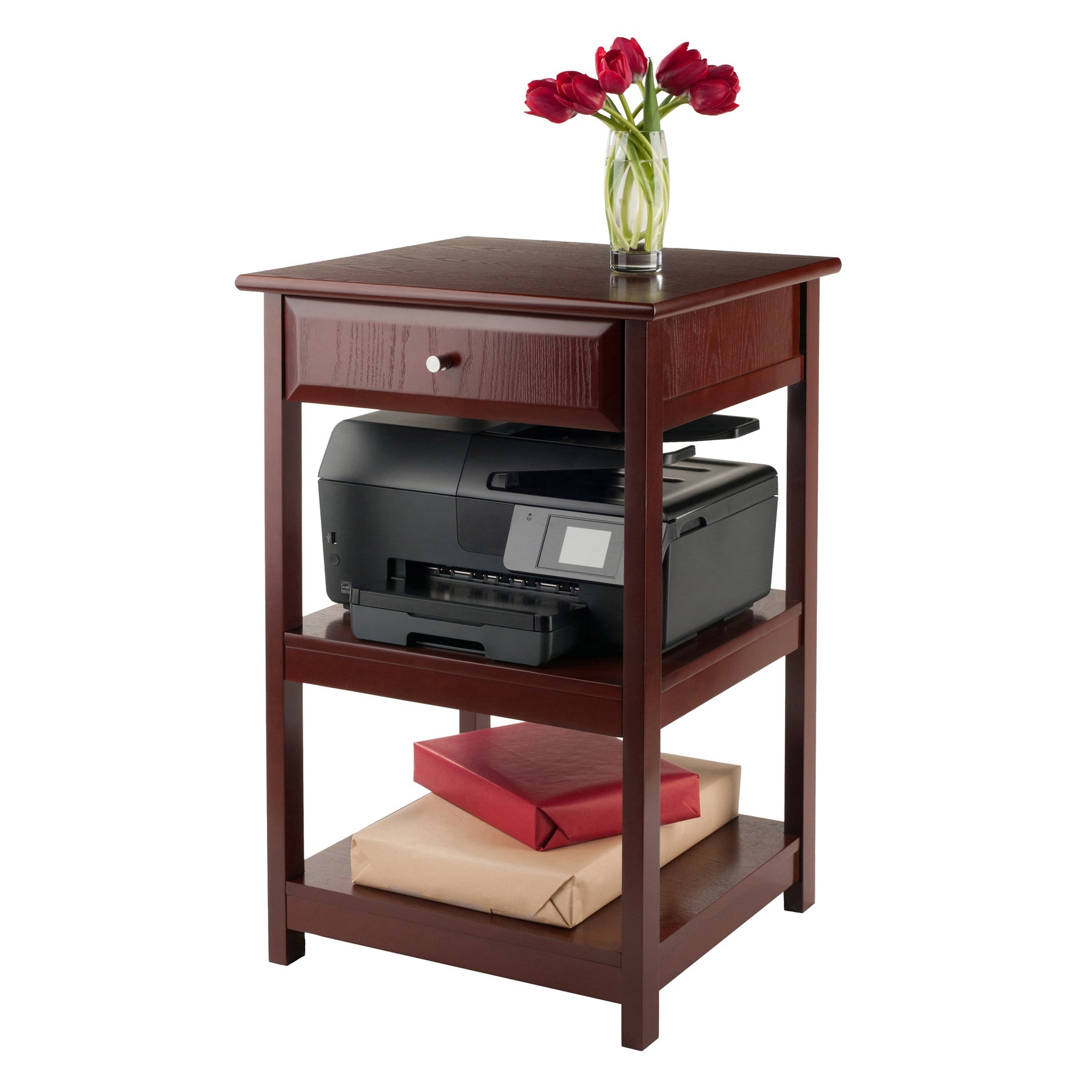 The Delta Printer Table is an ideal addition to any home or professional office. Place a portable printer on the large table top and have plenty of room on the open shelves for reams of paper, file boxes, and more. A printer or fax machine can also go on one of the open shelves, leaving the table top for a lamp or phone. A drawer provides additional storage for smaller office supplies. Designed to complement the Delta Writing Desk, the printer table works great as a stand alone piece. Finished in a rich Walnut. Printer Table overall size is 20.8"W x 20.2"D x 30.7"H. Made of composite wood in Walnut finish.