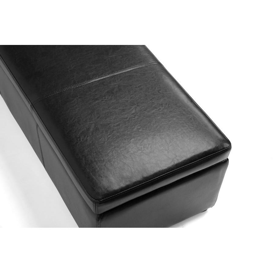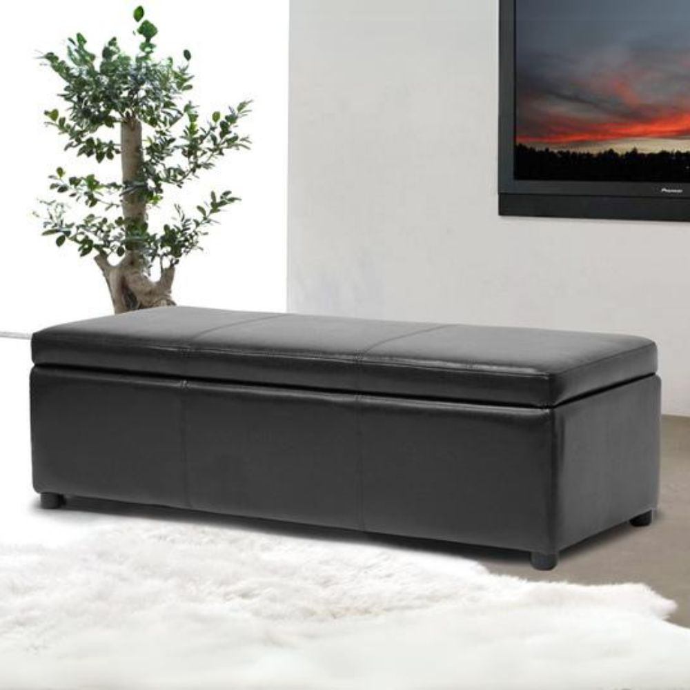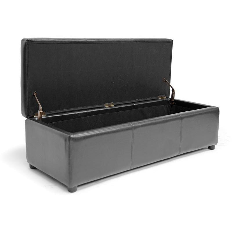 A great accompaniment to a sofa or a fantastic stand-alone item, our Dennehy Black Modern Ottoman offers contemporary style with old-school attention to craftsmanship. Hard to believe so much value can be had at a discount price. Soft-cornered upholstery and round legs combine for a cozy appearance. A kiln-dried hardwood frame gives it rugged endurance. Plus, plenty of storage and two black flip-top trays.