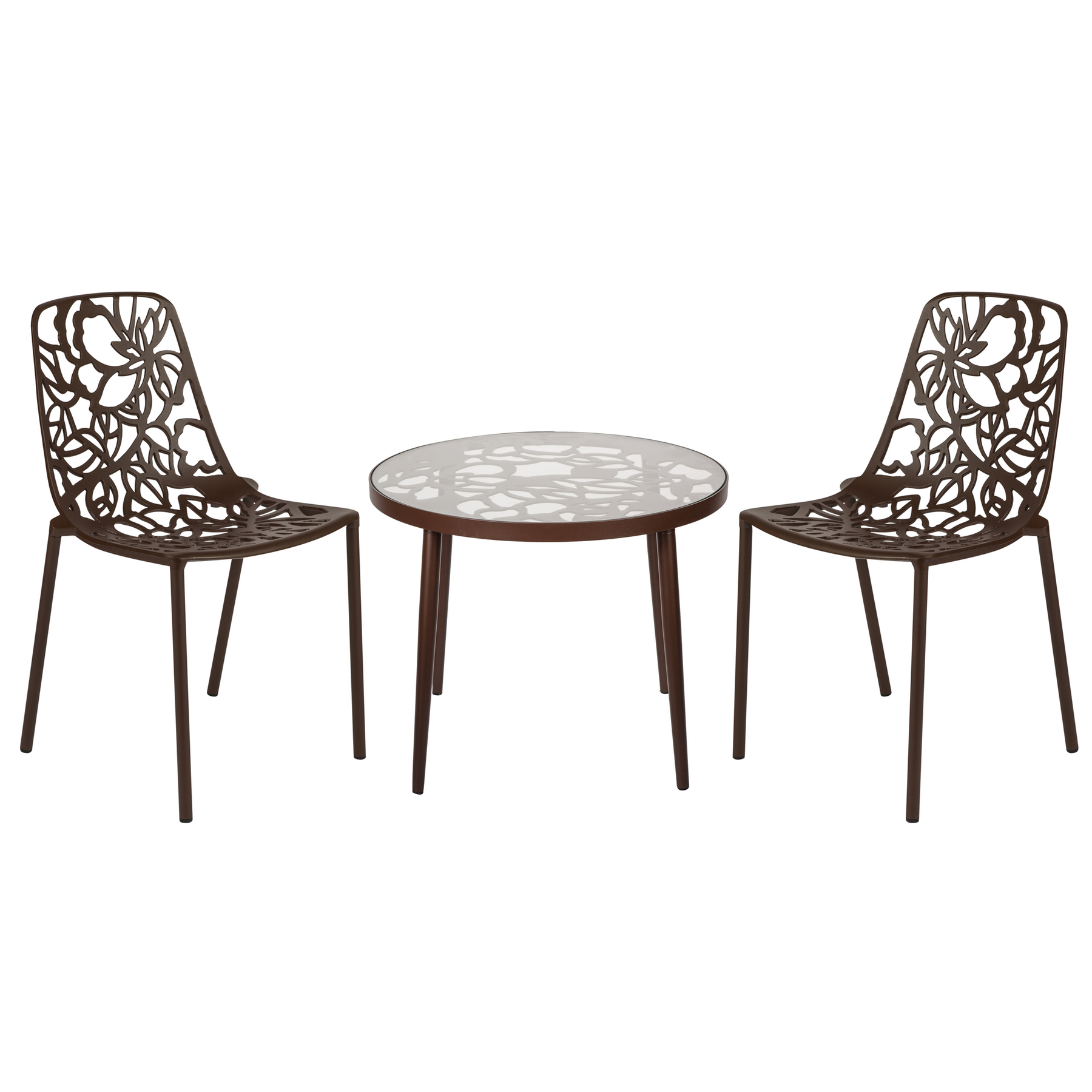 Devon Mid-Century Modern 3-Piece Aluminum Outdoor Patio Dining Set with Tempered Glass Top Table and 2 Stackable Flower Design Chairs for Patio, Poolside, Balcony, and Backyard Garden