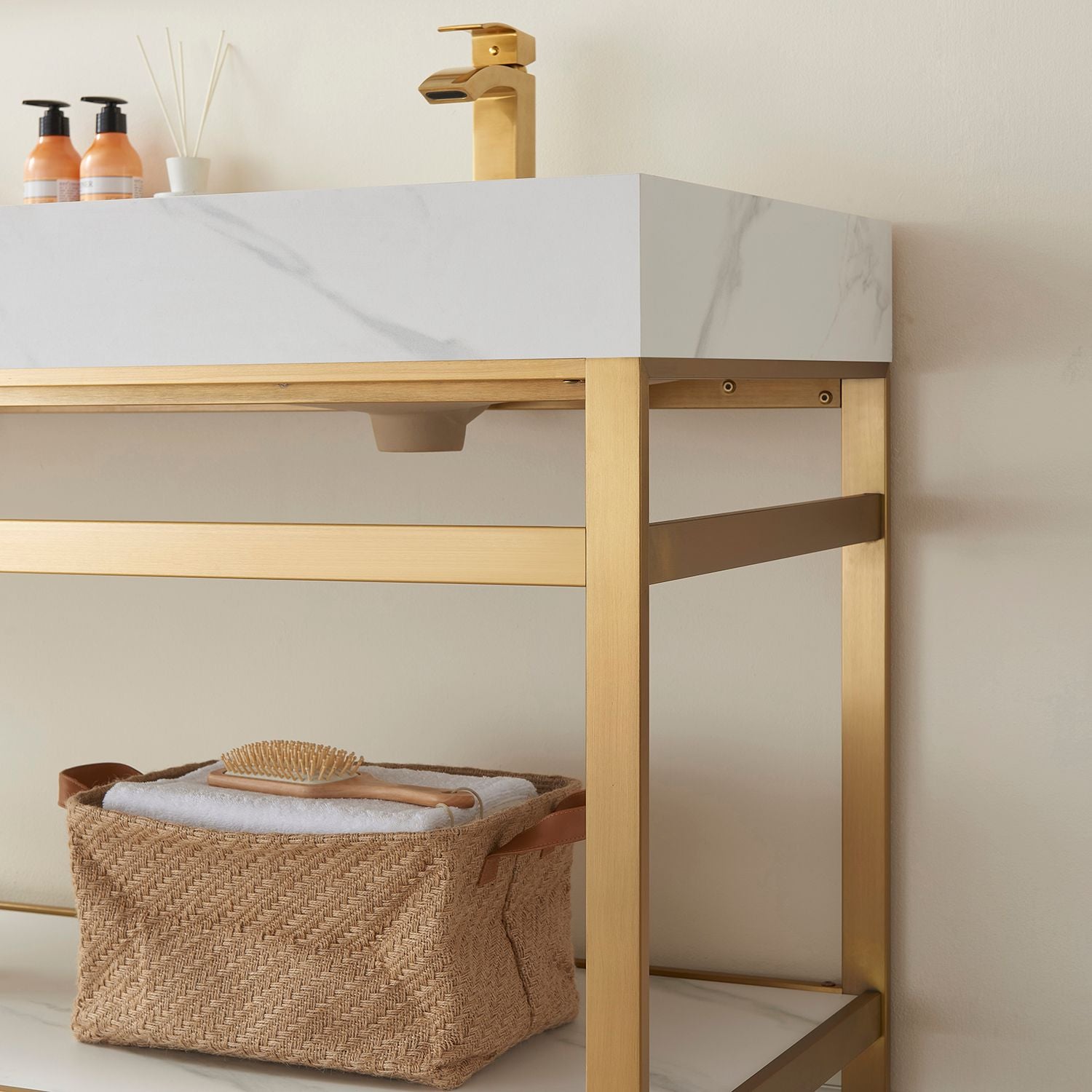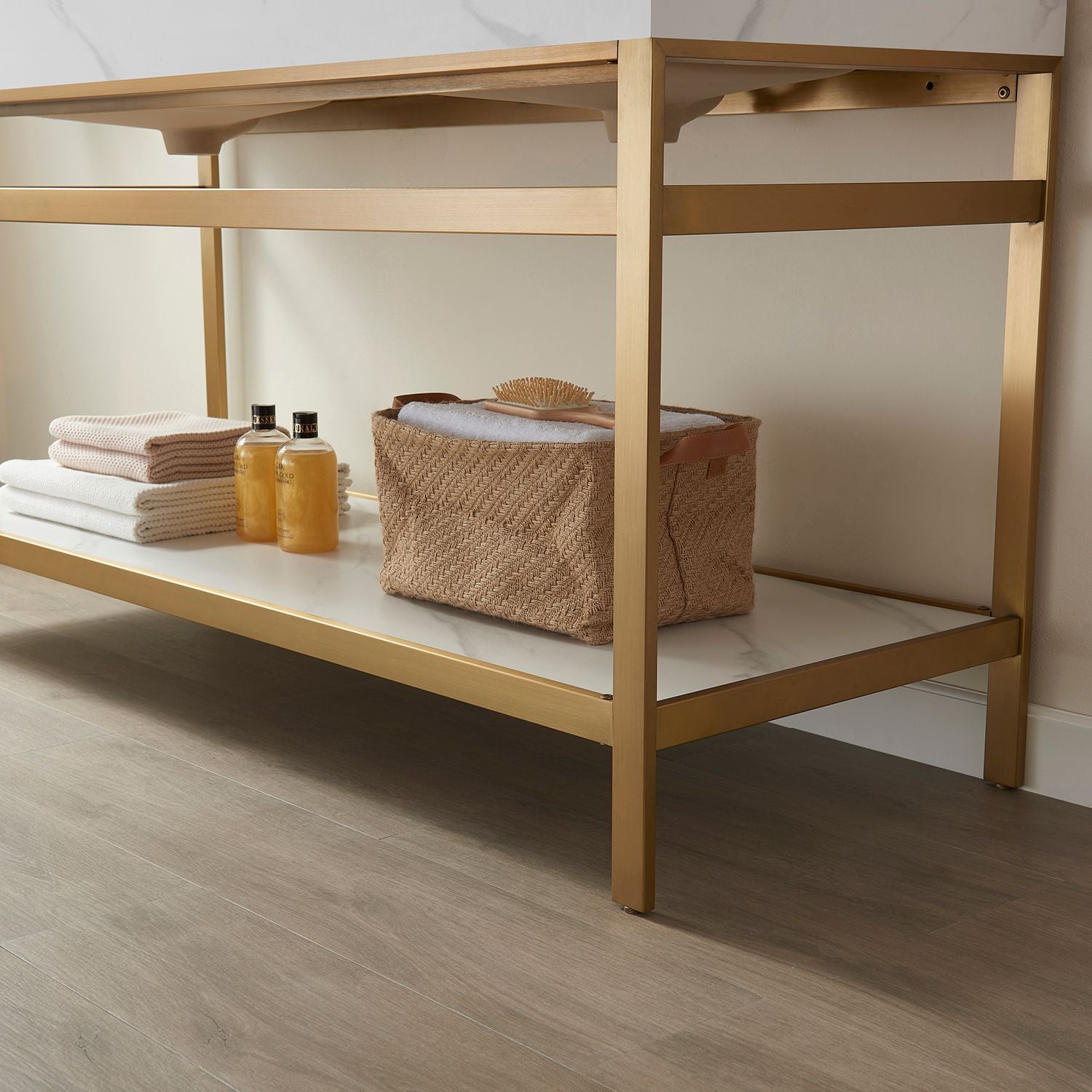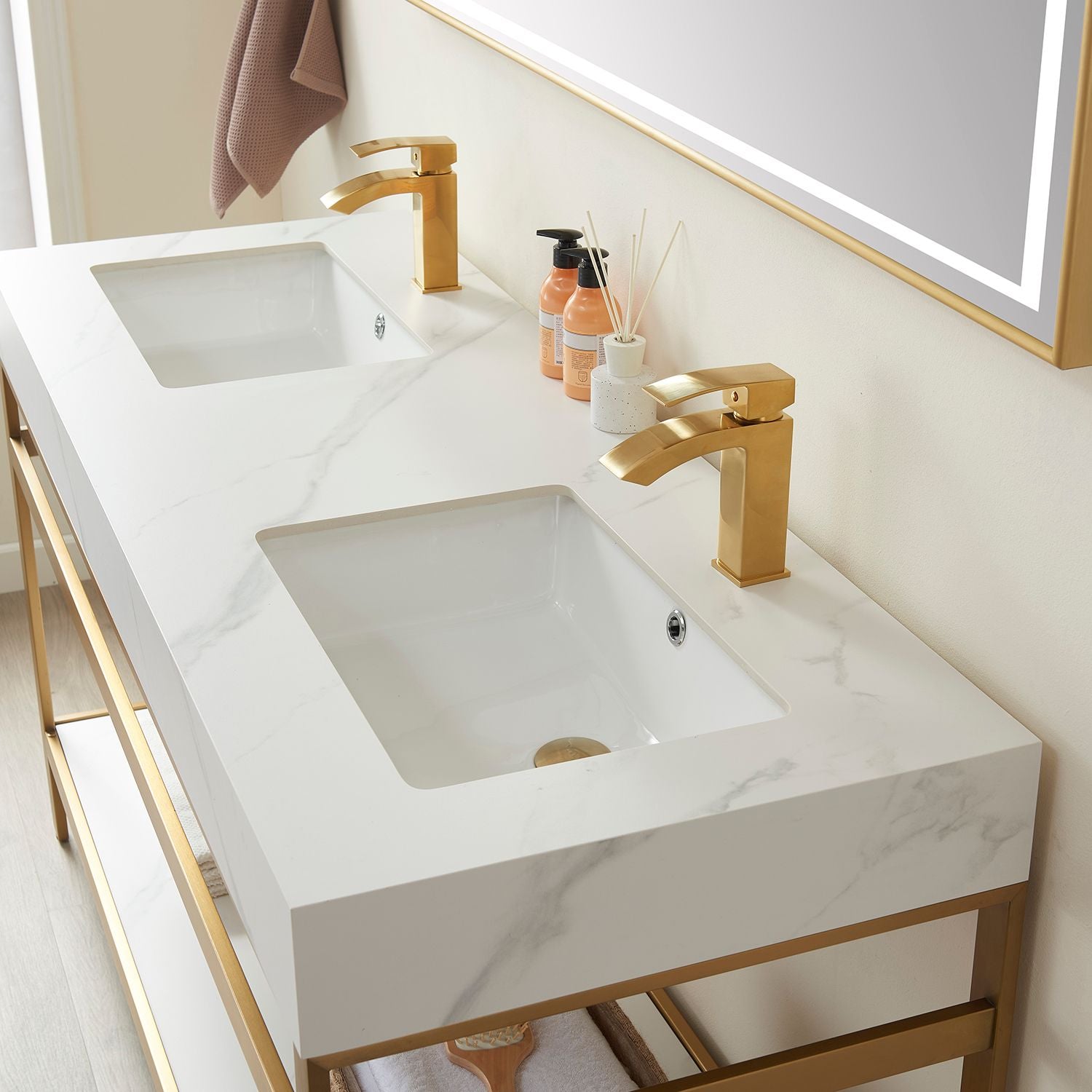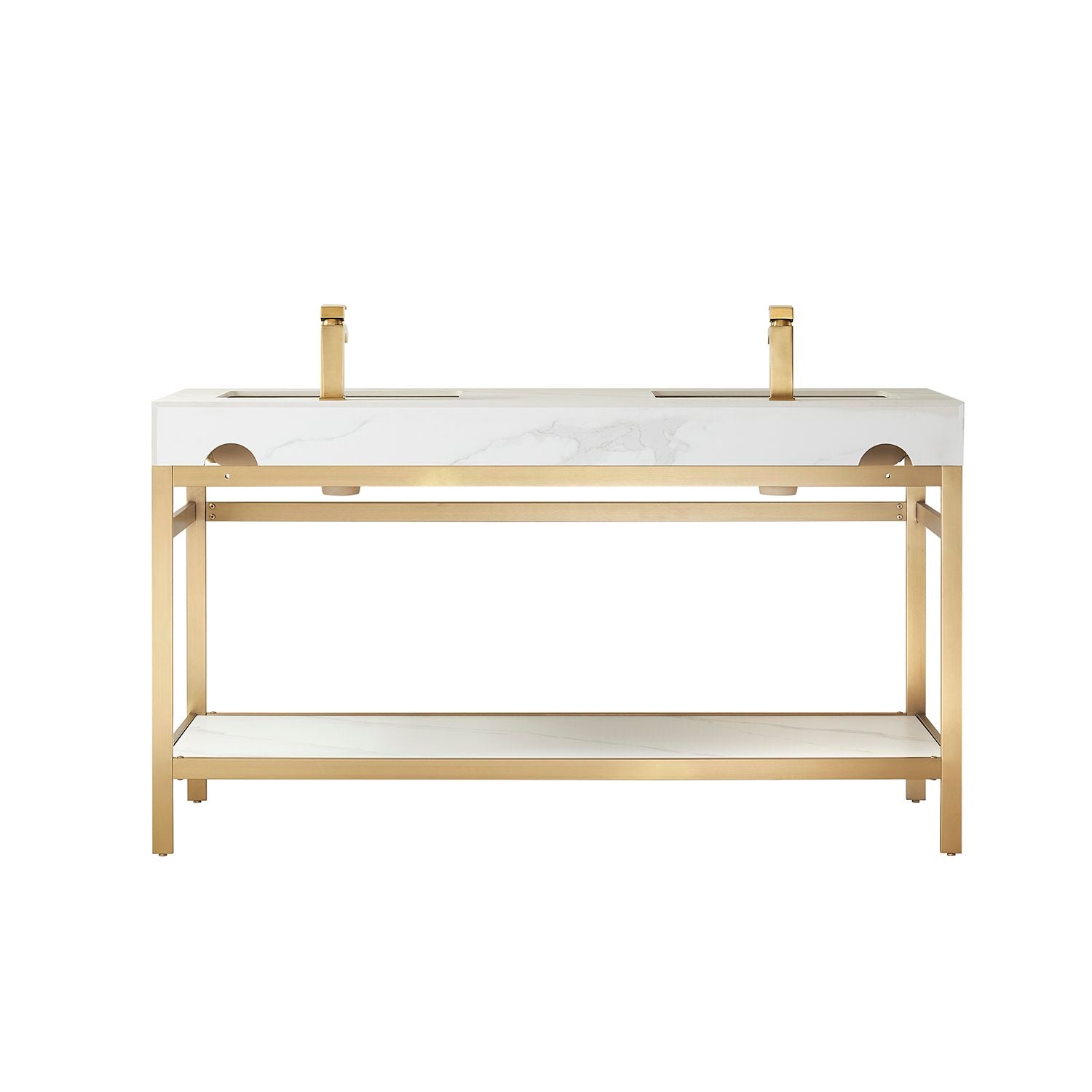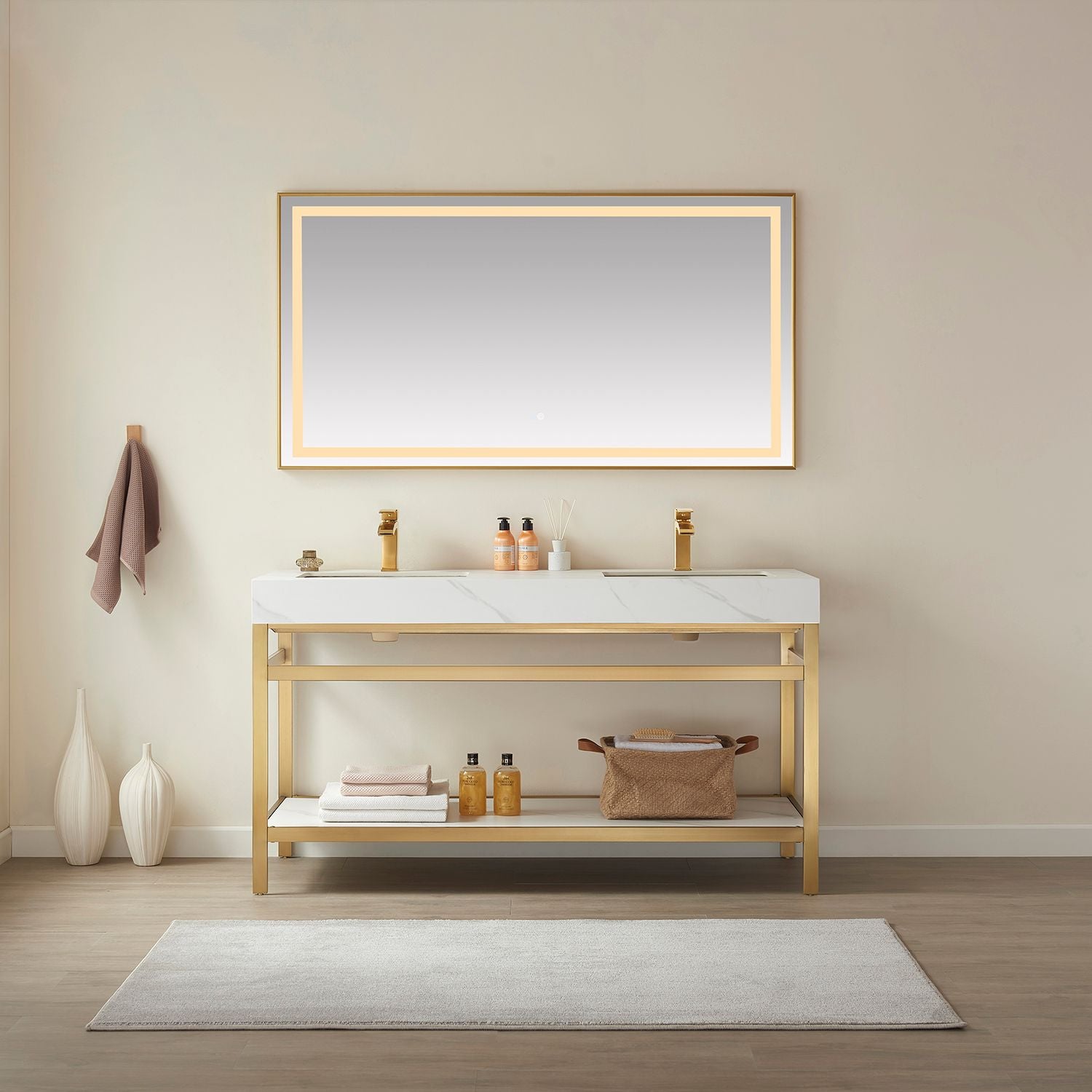 Funes 60M" Double Sink Bath Vanity in Brushed Gold Metal Support with White Sintered Stone Top and Mirror