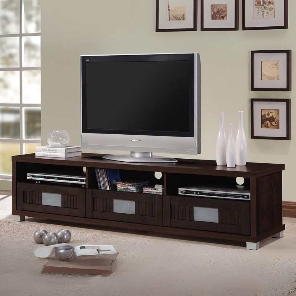 This sleek contemporary media console will be a sophisticated addition to your living room. The long low piece features clean lines, in a rich dark espresso finish that will complement your decor. The generous top surface will accommodate a large television up to 75 inches flat screen TVs , while open compartments below are ideal for electronics components. The large lower drawers and shelves offer lots of enclosed storage, great for movies, gaming equipment, and other media items that you want to keep hidden. The combination of MDF and frosted glass decoration accent the drawer front for a cool modern look that you will love. Create a chic look in your living room with this stylish contemporary TV stand.