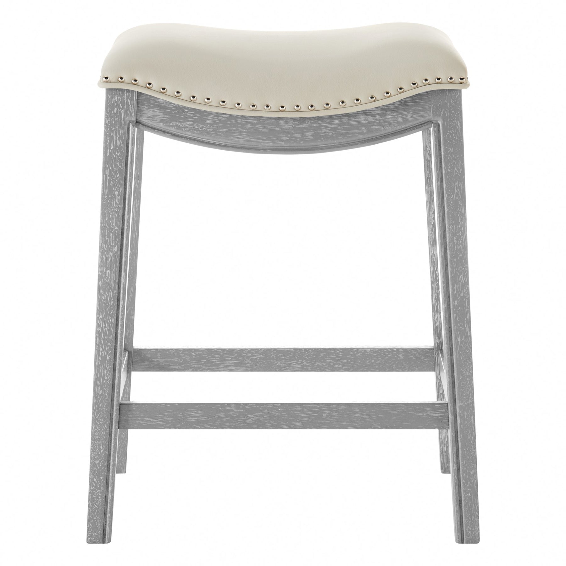 Stylish, Sturdy, Comfortable, and Affordable – Quality with confidence. This 25.5" height counter stool is updated with Ash Gray painted wood frame and includes desirable features like individually placed Silver nailheads and faux leather saddle seat. Foot rest is included for comfort and stability.