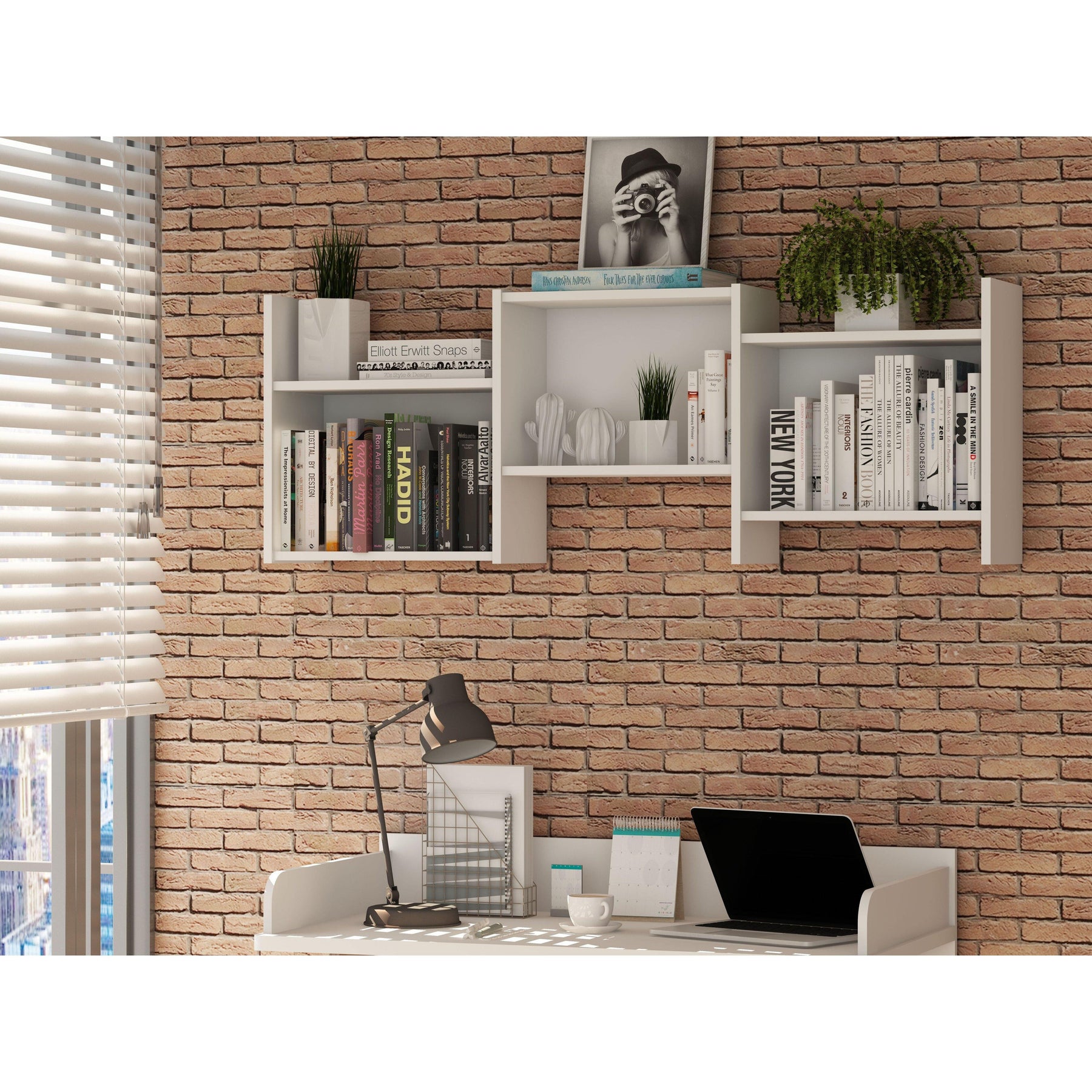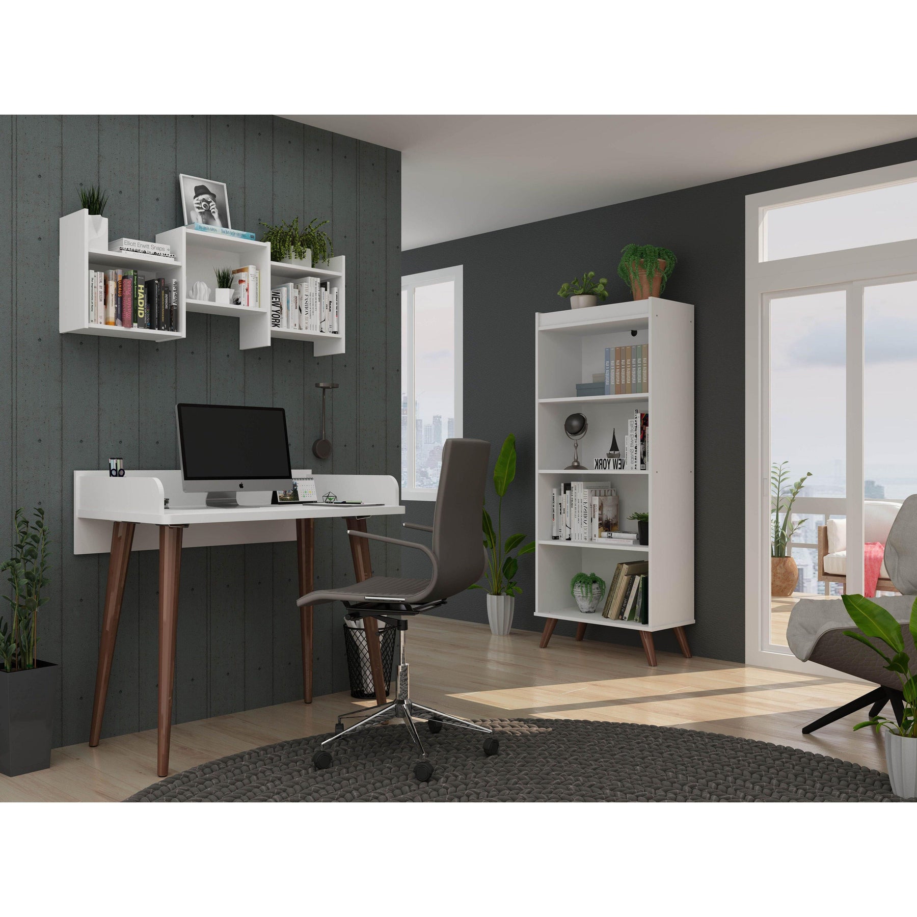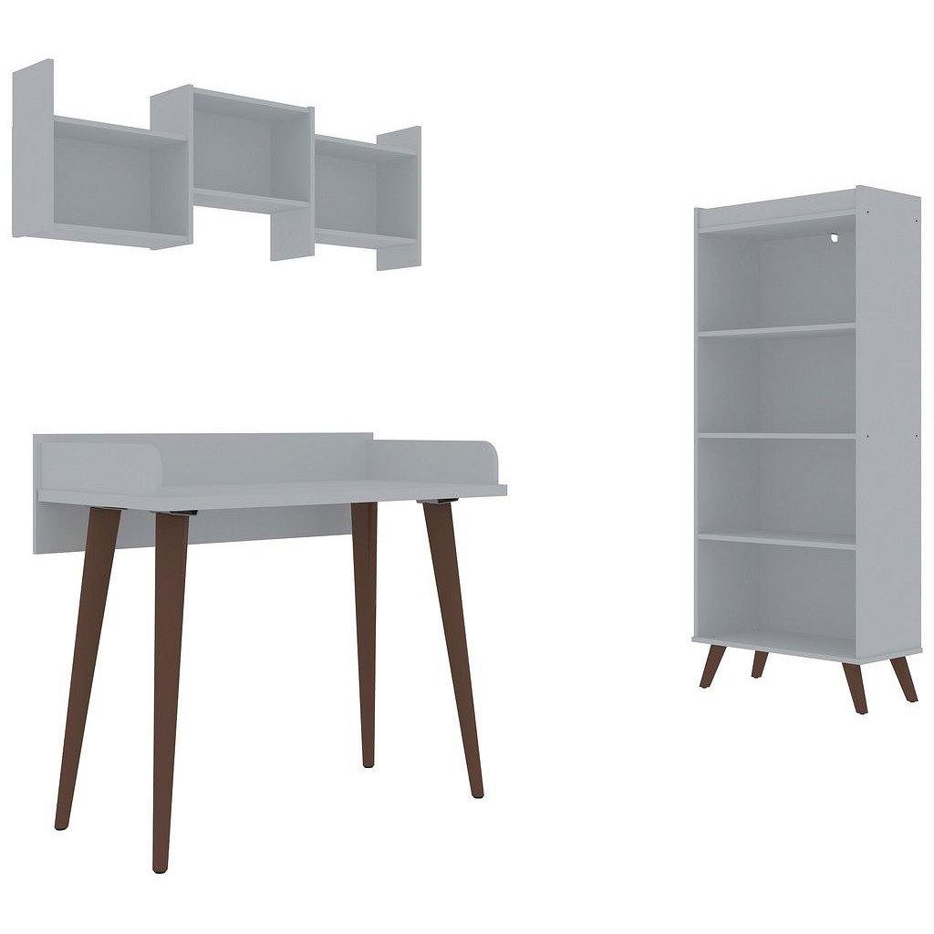 • Includes 1 Bookcase, 1 Writing Desk, and 1 Trio-Floating Shelf.