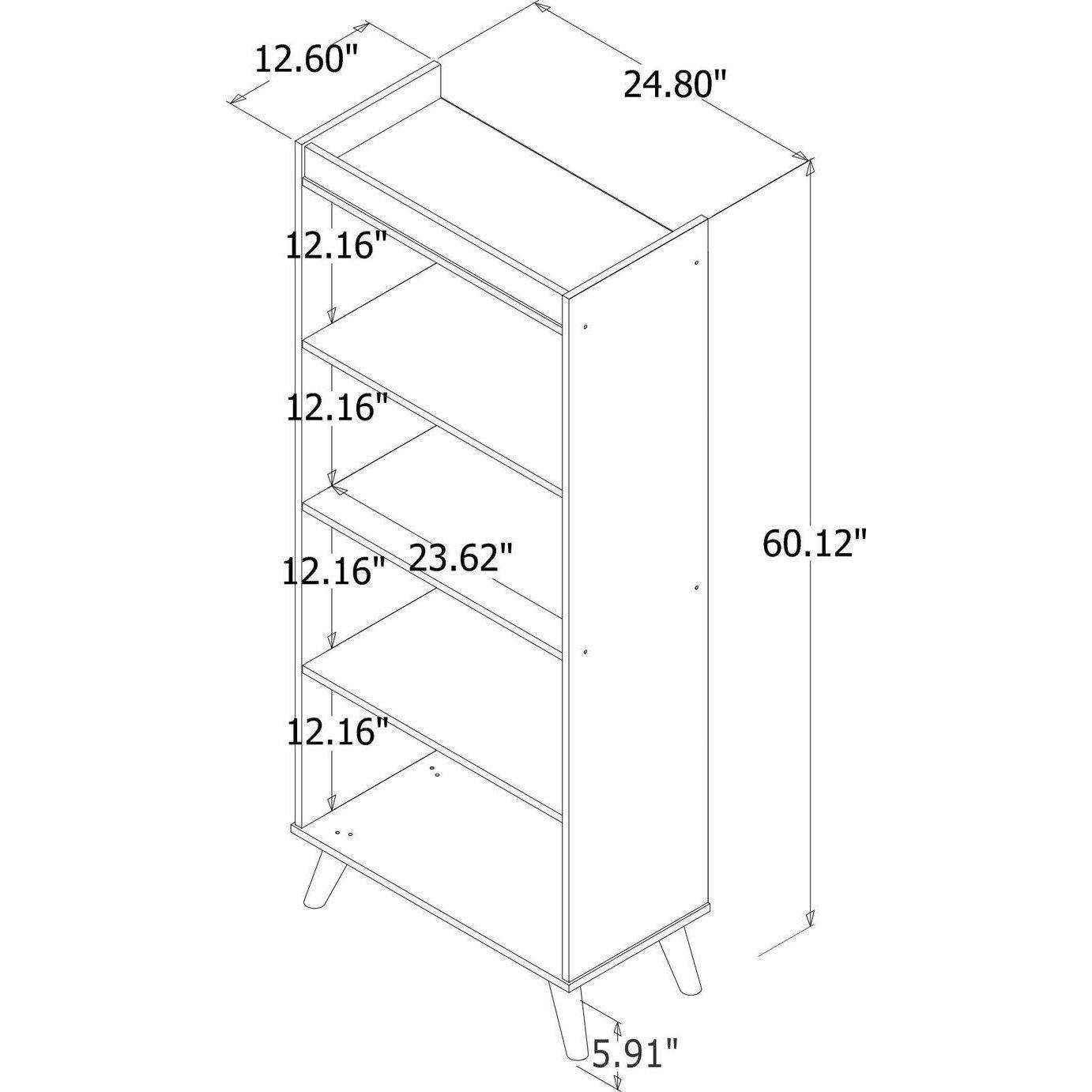• Bookcase Includes 4 Wide Fixed Shelves. Shelves are 23.62" Wide, 12.60" in Depth, and 12.16" in Height. Optional Brackets Included to Mount to Wall for Safety.