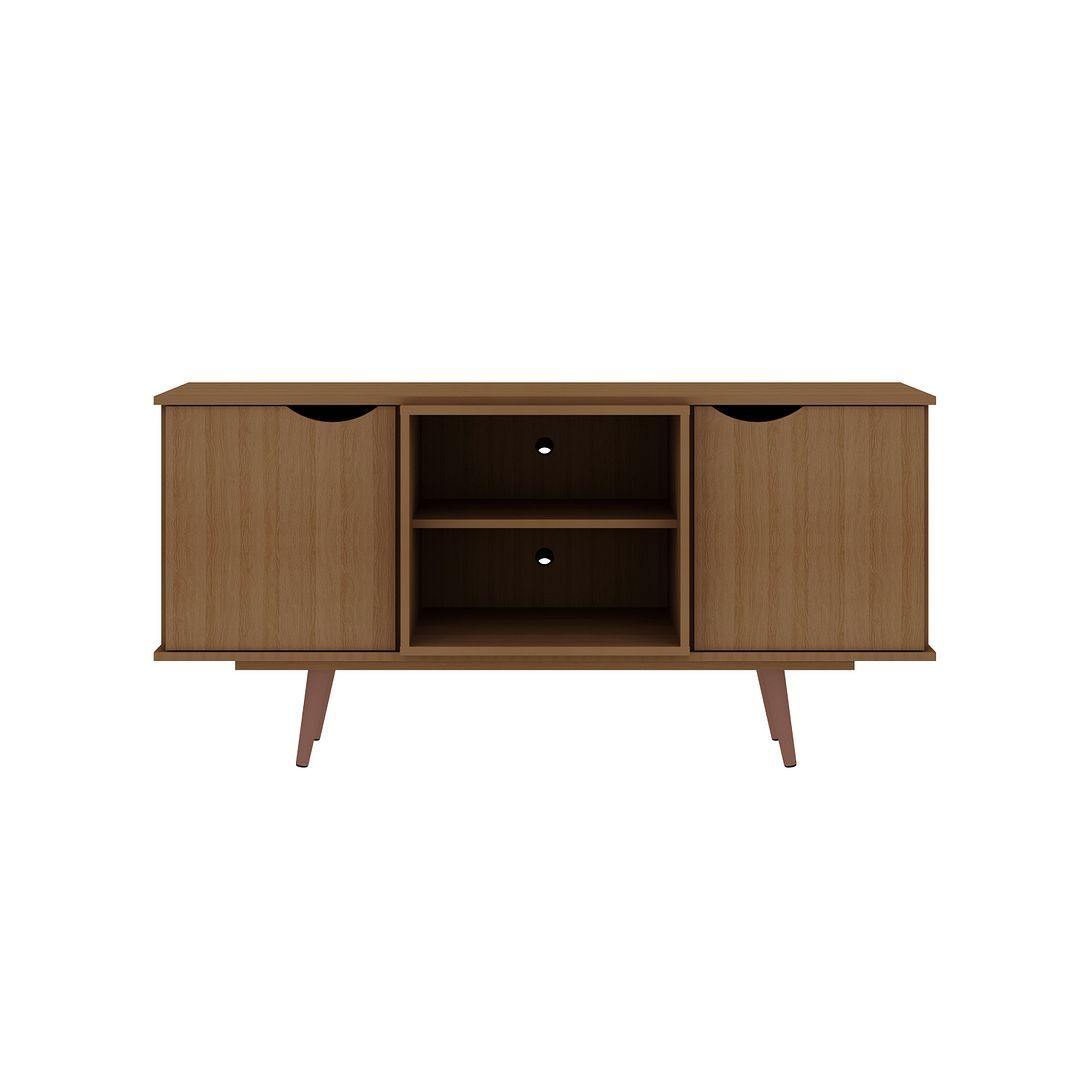 Gather the family together for the ultimate Netflix night in with the Hampton TV stand that makes movie night comfortable and convenient, featuring plenty of open and concealed storage to tuck away media accessories, favorite DVDs, books, extra throw blankets and more. Functional and crafted with mid-century modern flair, this piece blends beautifully with any existing decor, while splayed legs and artful detail keep it classic and fresh.