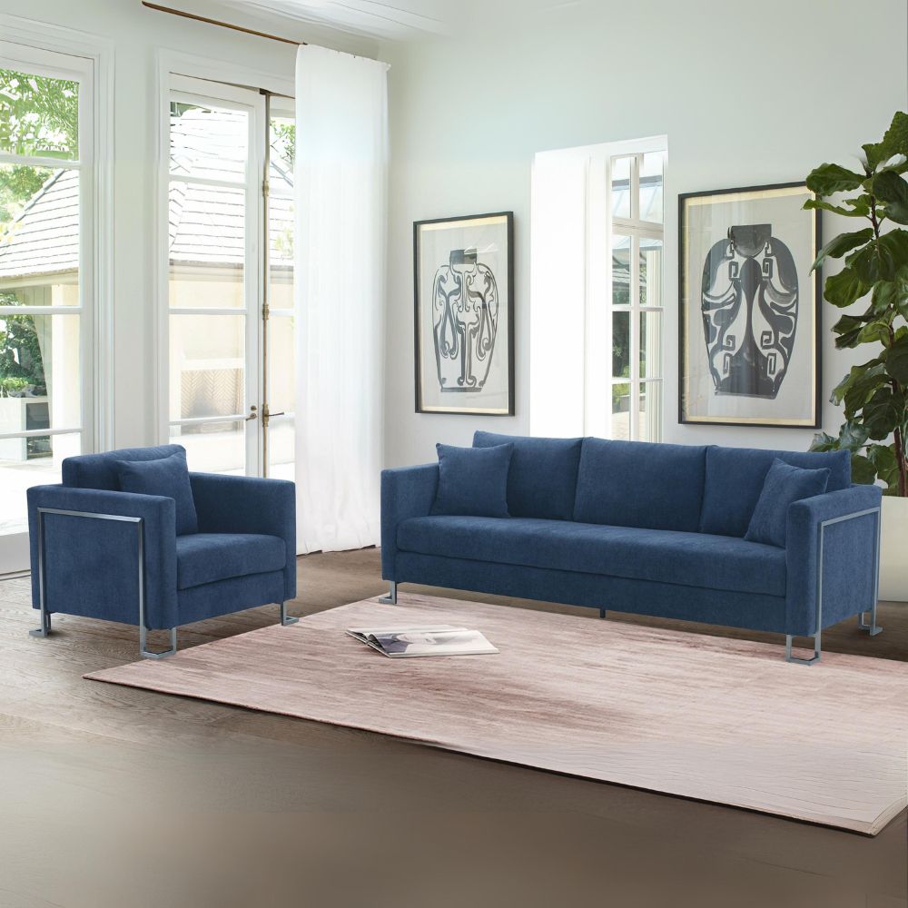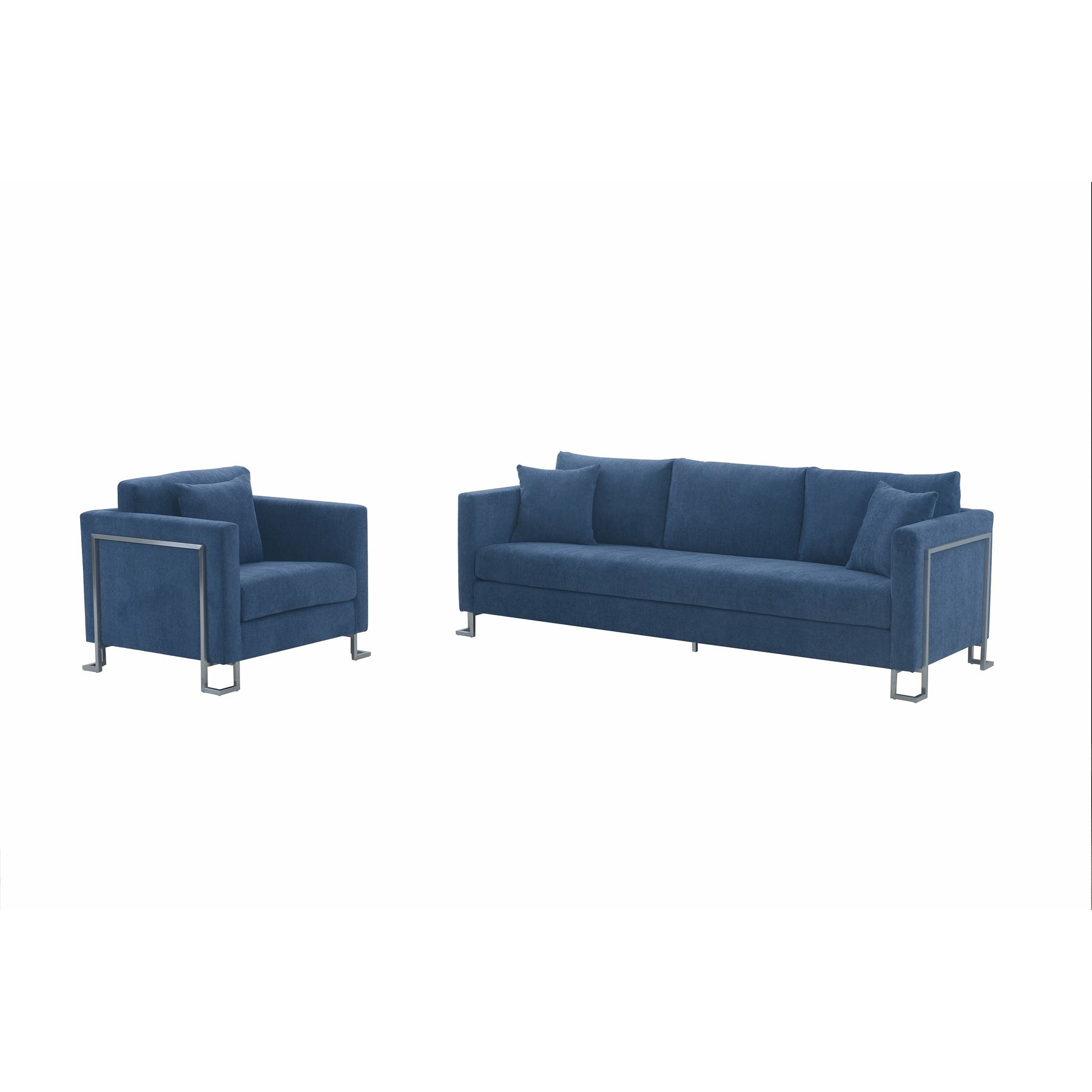Find captivation, comfort, and completeness with the fantastic Heritage 2 Piece Fabric Sofa & Chair Set in Blue from Armen Living. The high seat back and arms on both the chair and sofa give this set a comprehensive aesthetic, checking all the requirements necessary for great seating options. The Heritage's seat cushions are filled with premium dense foam padding, helping relax your body after a long day. The sturdy frames and strong metal legs add to the durability of this set, giving you years of enjoyment. The Heritage comes with three additional toss pillows to accessorize your set with. The Heritage is available in your color choice of blue and Gray fabric.