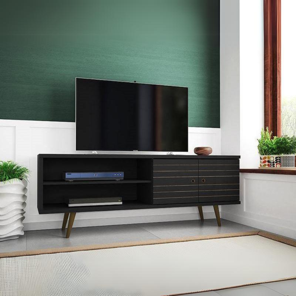 Liberty 62.99" Mid-Century - Modern TV Stand with 3 Shelves and 2 Doors in Black