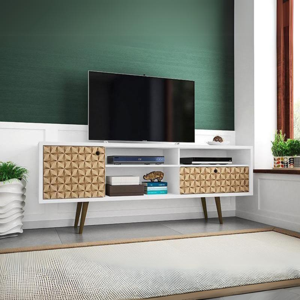 Liberty 70.86" Mid-Century - Modern TV Stand with 4 Shelving Spaces and 1 Drawer in White and 3D Brown Prints