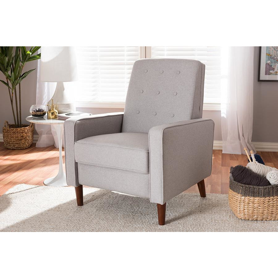 Sit back and relax in style with the Mathias recliner. The Mathias recliner's modern and contemporary-inspired look exemplifies the minimalist chic of modern design. Constructed with sturdy hardwood and plywood, this chair is built to last. Enjoy comfort with the chair's reclining back, raiseable footrest, and hidden steel push-back mechanism. The Mathias features light grey fabric, button-tufted upholstery over foam padding, making this a cozy addition to your living room, home office or entertainment room. Walnut-finished eucalyptus legs complete the sophisticated style of the Mathias. Made in China, this recliner requires assembly.