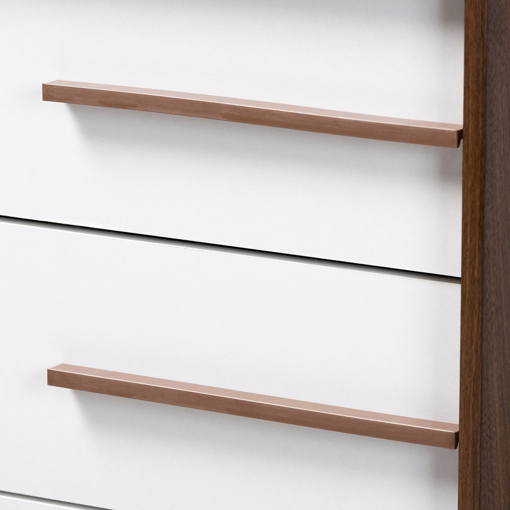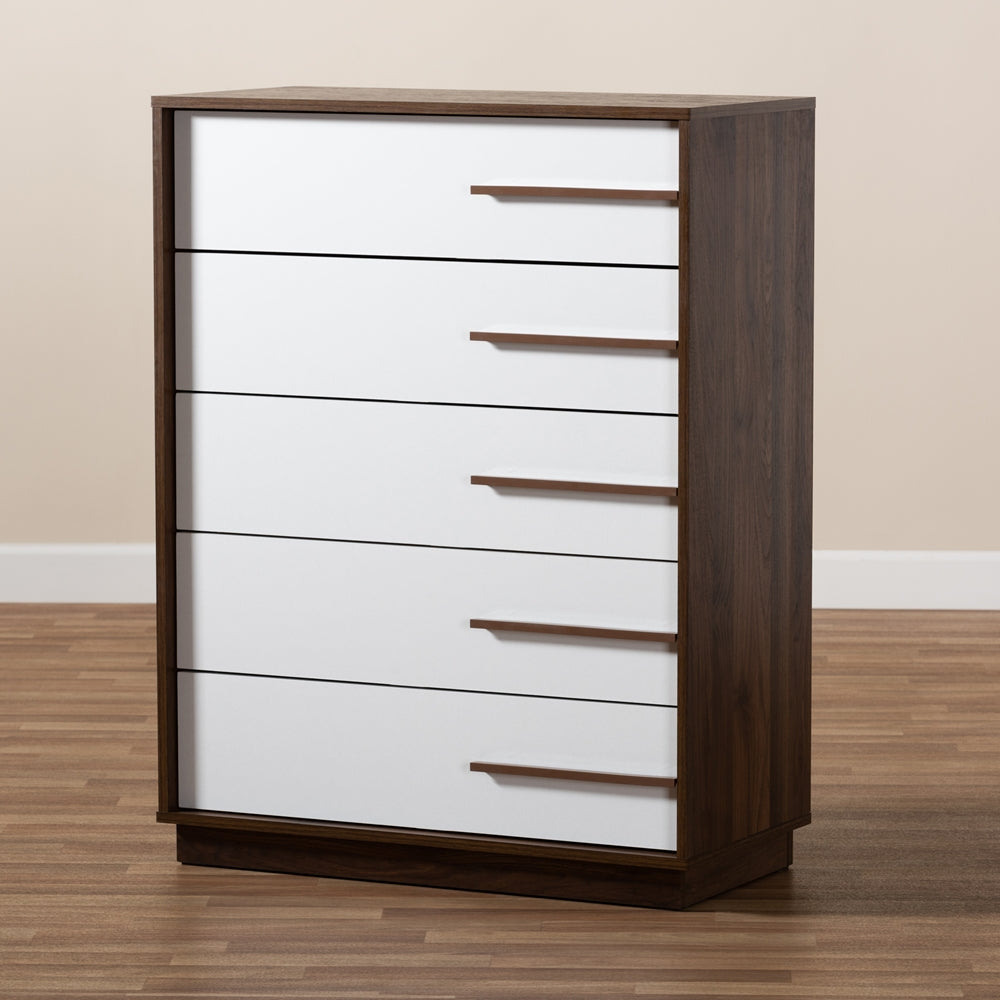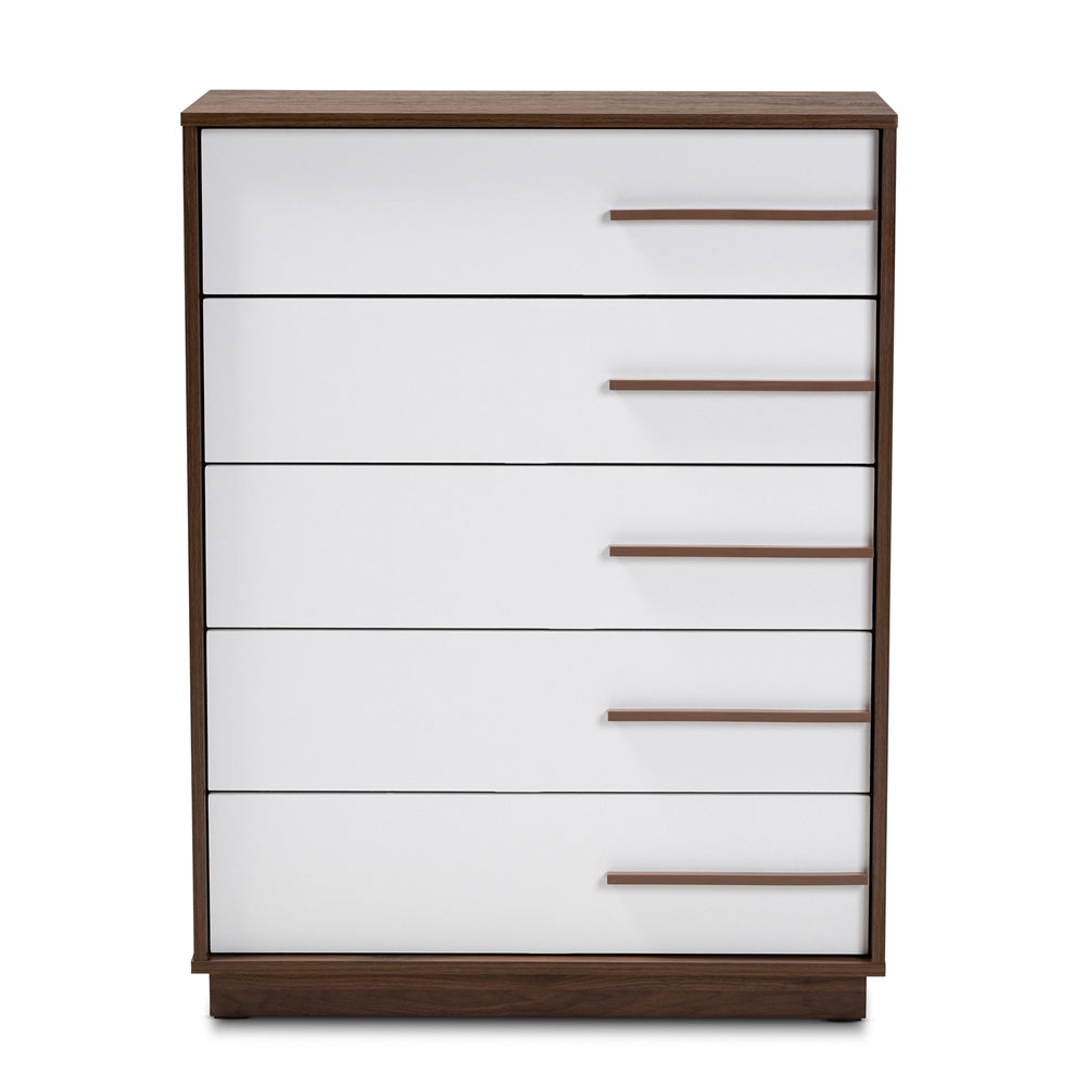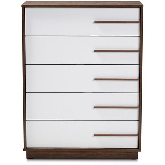 Mette Mid-Century Modern Two-Tone White and Walnut Finished 5-Drawer Wood Chest