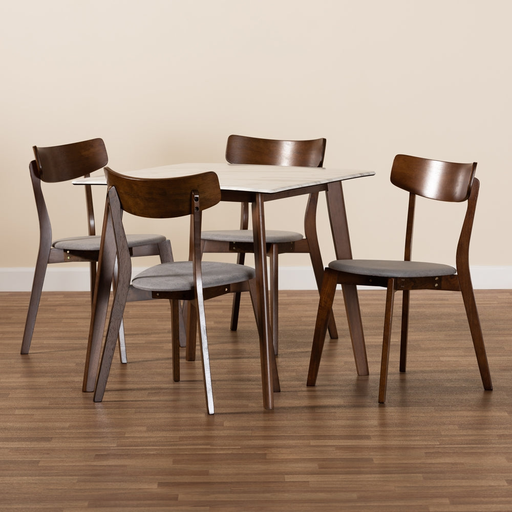 Reba Mid-Century Modern Light Grey Fabric Upholstered and Walnut Brown Finished Wood 5-Piece Dining Set with Faux Marble Dining Table