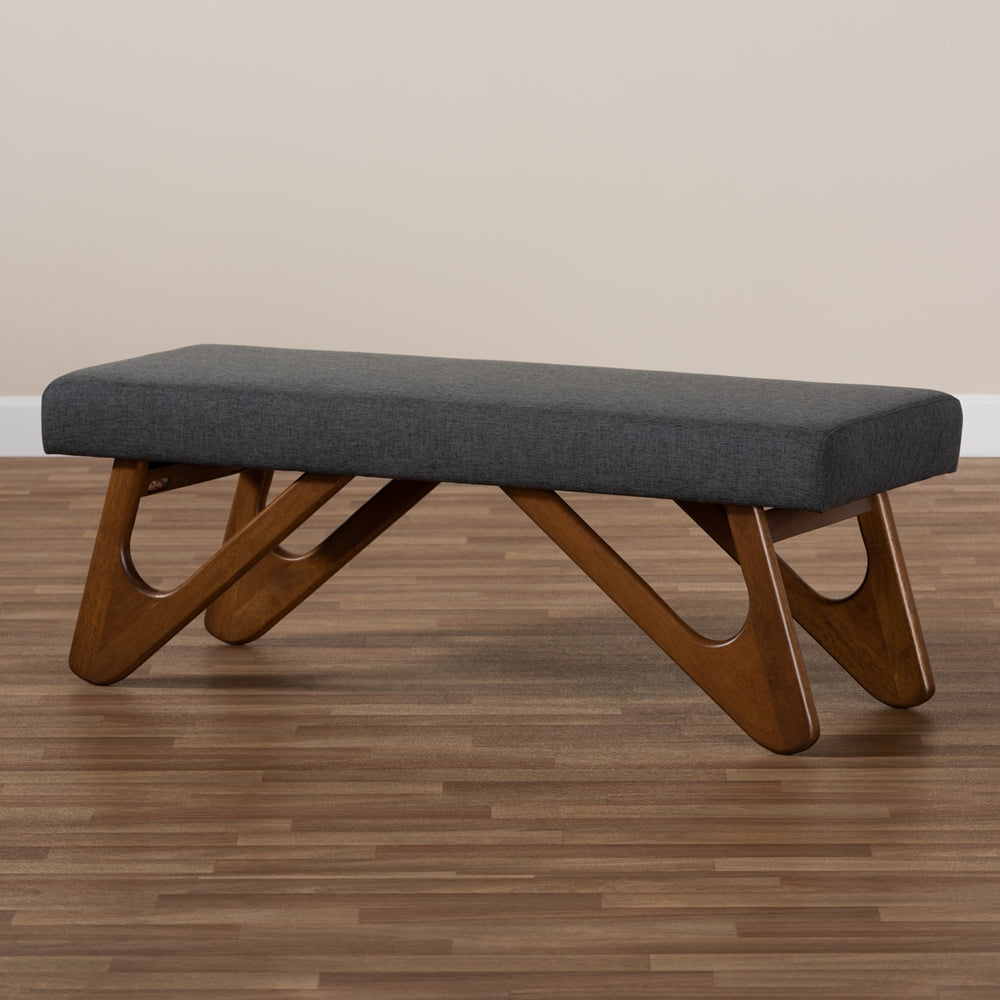 Rika Mid-Century Dark Grey Upholstered Walnut Brown Finished Boomerang Bench