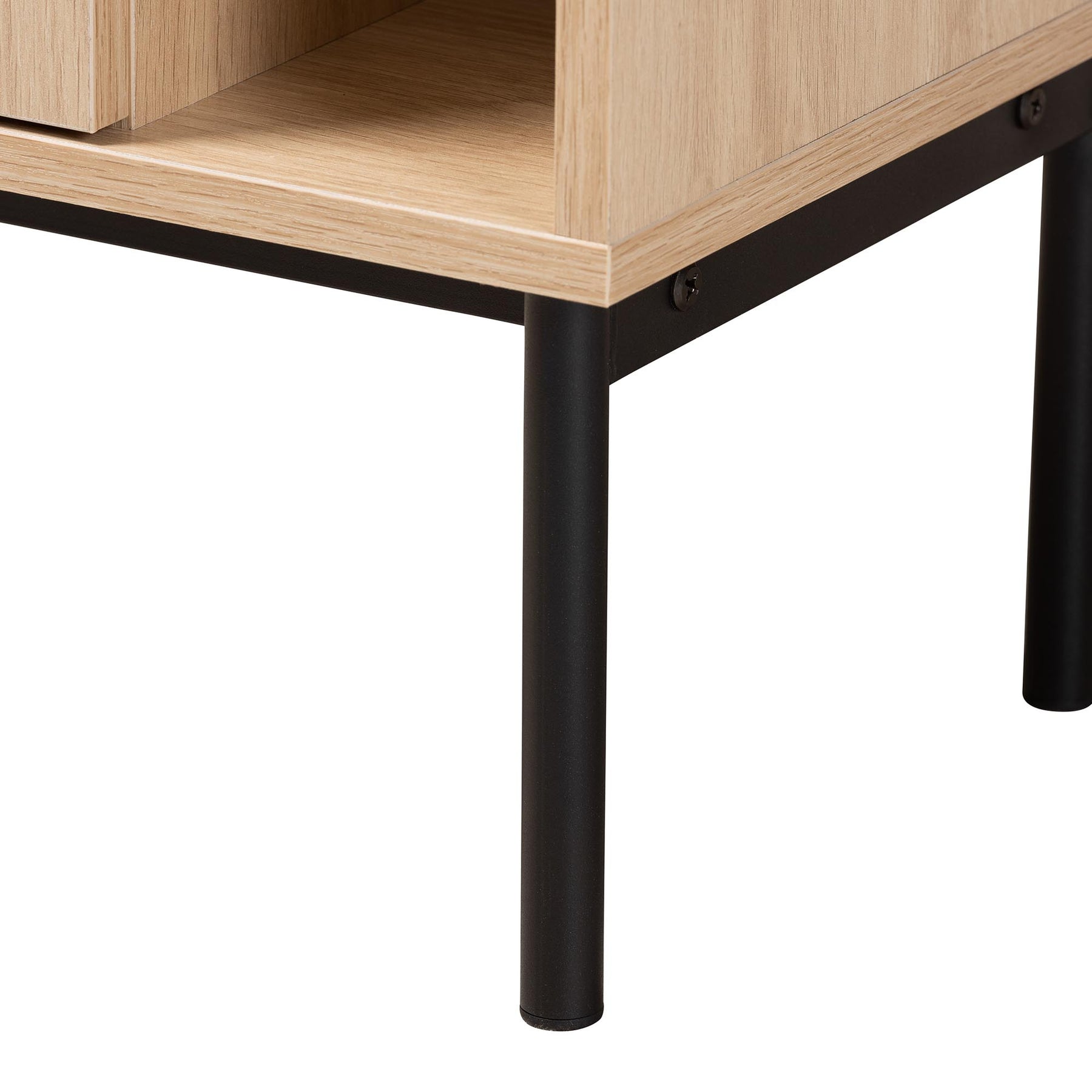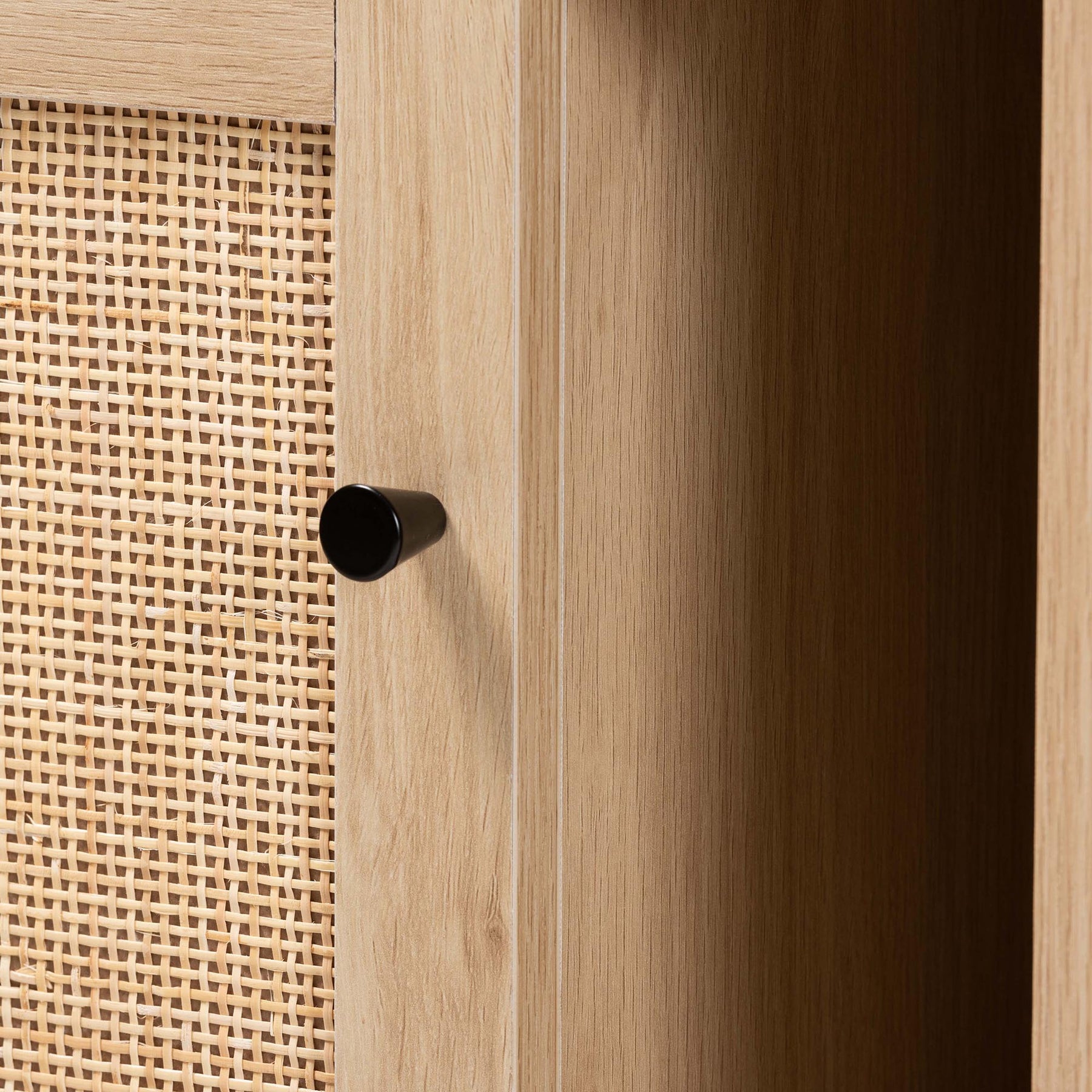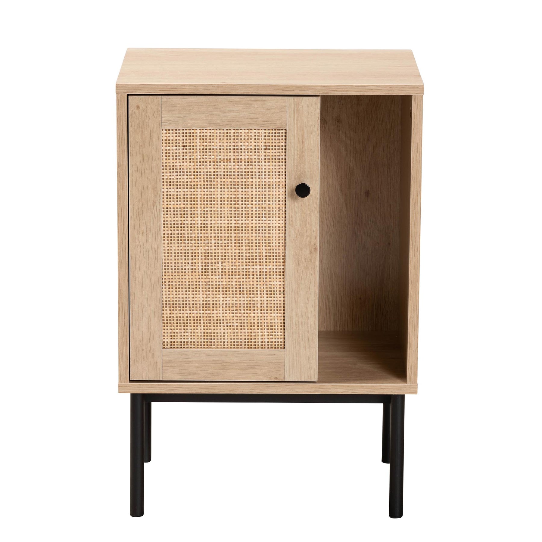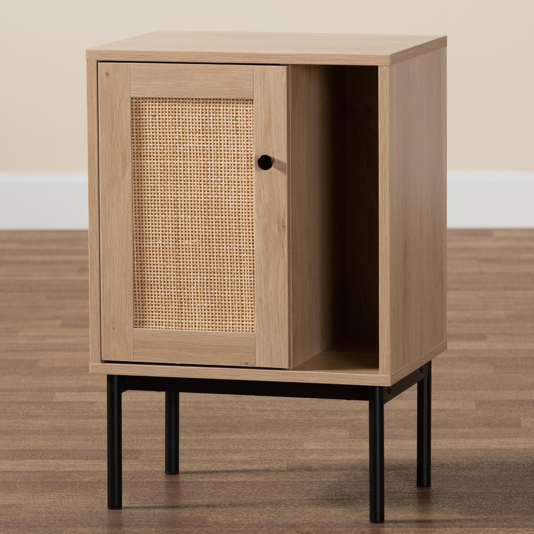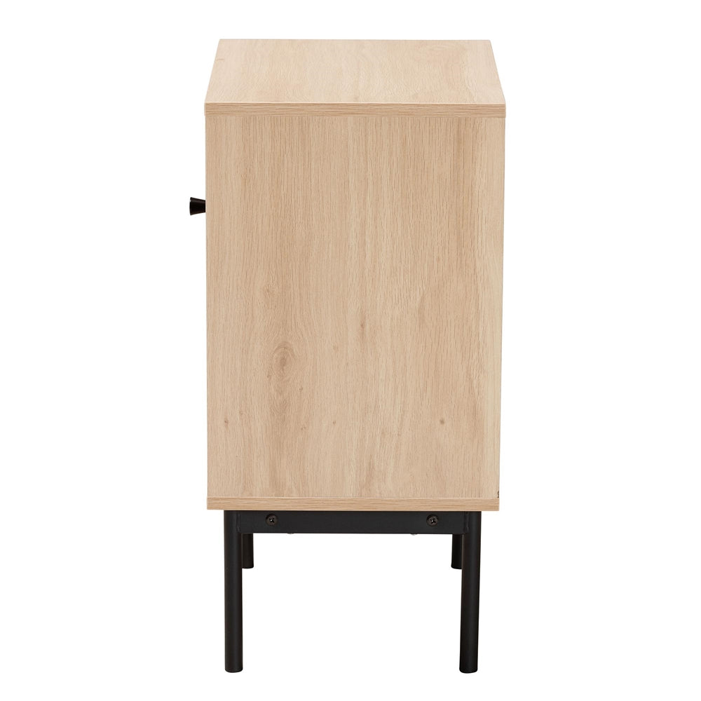 Sherwin Mid-century Modern Light Brown And Black 1-door Cabinet With Woven Rattan Accent
