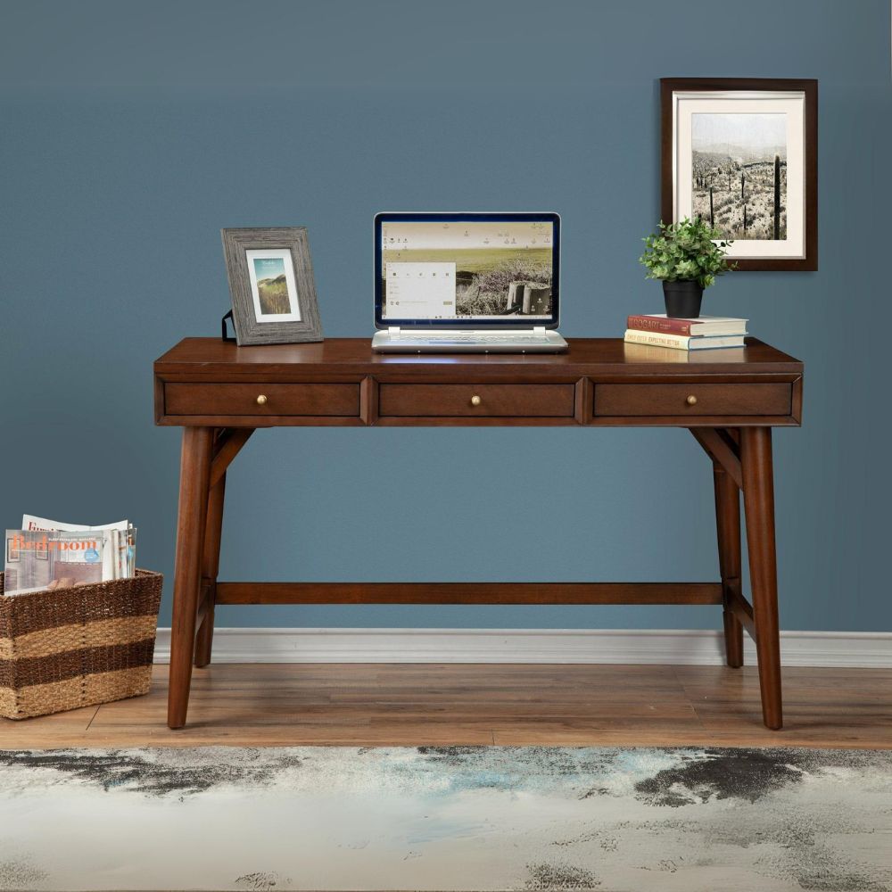 Influenced by Mid-Century design, the Flynn 3-Drawer Desk combines clean-lines and tapered legs for a distinctive look. Featuring Mahogany wood solids and Okume veneer, use this piece to anchor your home office in sophisticated style. Finished in a rich walnut color, the drawers are felt lined and have accent hardware.