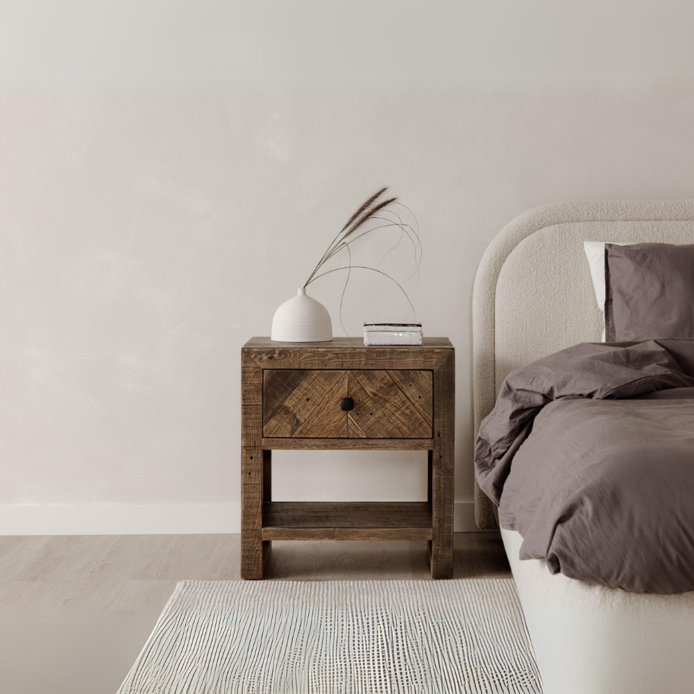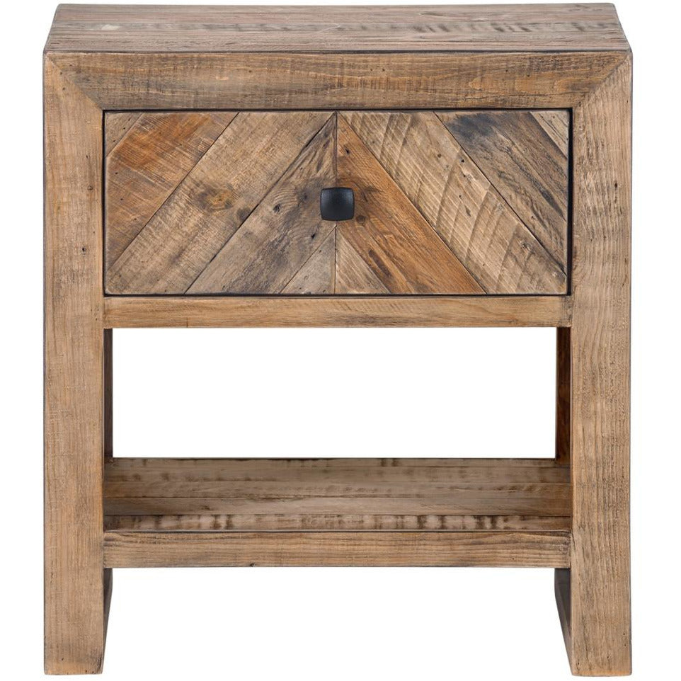 Made of solid reclaimed pine, the Teigen Nightstand exhibits strong detailing and plenty of storage with its single drawer and open shelf. Layered detail is apparent in the hand selected pieces of wood, making your nightstand a unique piece of the collection. Pairs seamlessly with the Teigen bed and dresser for a uniform look to your bedroom.Crafted from solid wood for a natural look and feel. Reclaimed materials for an eco-friendly product.1 spacious drawers. One shelfWipe wooden furniture down regularly with a clean, dry cloth to remove dust. Use warm water and a mild soap to clean wooden furniture. Place your wooden furniture away from prolonged direct sunlight as this can result in 'spotting,' a phenomenon where bright and dark spots appear across the surface.Made in VietnamRustic. Color: Brown We offer 1 Year warranty. Dimension:22W 16D 22H. Product Weight:28.66 lbs. Material: Solid Reclaimed WoodPlywoodNew Pine WoodWe understand how important your home is and how decorating your kitchen, dining room or bedrooms with classy, contemporary furnishings can help make it a place that reflects who you are. We believe in the power modern furniture has in creating not just a home but YOUR home. We believe in feeling good about our home's environment, and we think you do too.