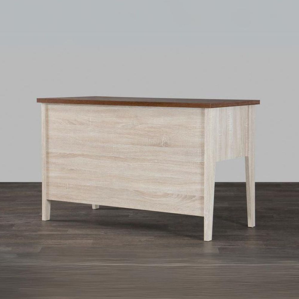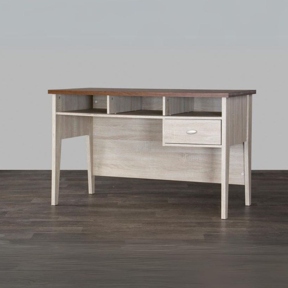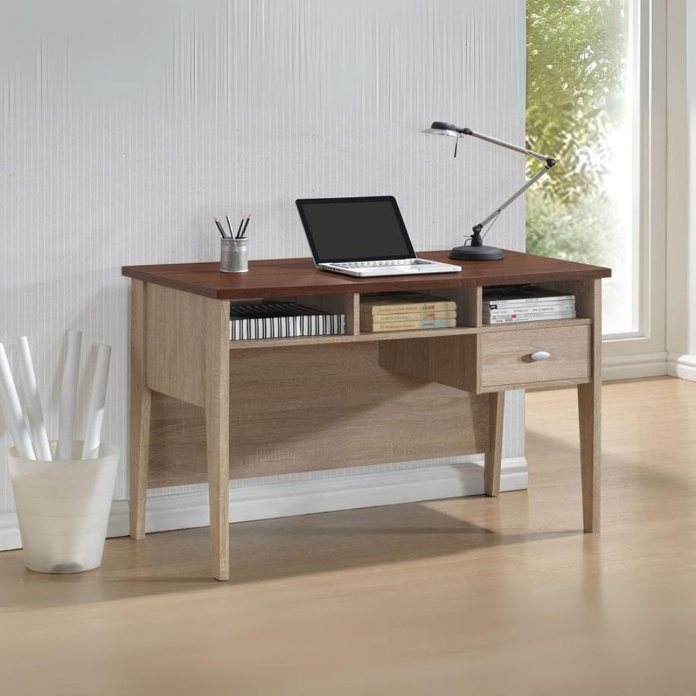 Our Tyler Writing Desk has flair to spare. This contemporary piece is more than a desk, it’s an accent in its own right. Sure, its generous storage space makes it practical, but its dashing design-featuring two-toned wood hues and a genuine metal drawer pull-encourages placement beyond home-office confines.