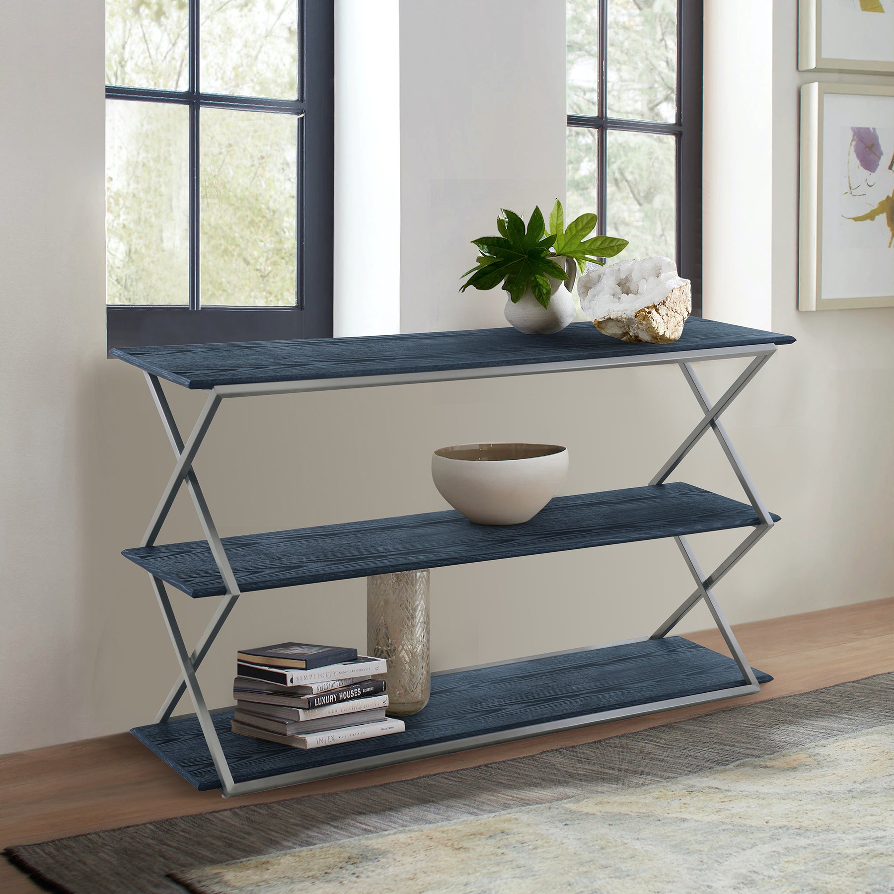 The Westlake Black Wood and Brushed Steel Console Table from Armen Living will help reduce clutter in your entryway or living room area and upgrade your home decor! The Westlake table features three tiers of resting shelves that maximize your storage space - giving you ample surface area to place your favorite personal items or decorative centerpieces. The wood of the console table is waterproof and wear-resistant, fighting off everyday wear and tear and giving you years of enjoyment. The craftsmanship shown through the design of the table is very apparent - the rich silver accents, the unique x-shape frame, and the gorgeous wood all contribute to this special piece.