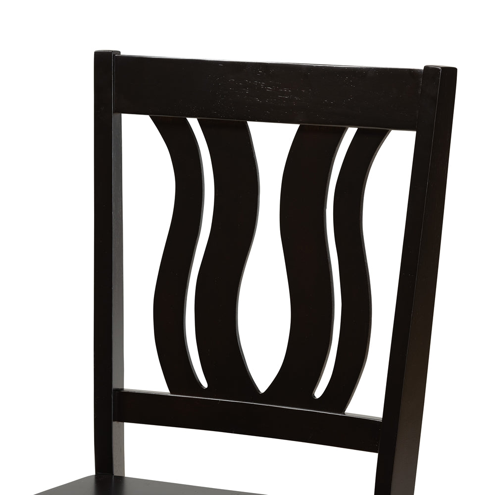 Featuring a unique, visually striking design, the Zamira dining set adds elegance to any dining space. Made in Malaysia, this wooden set includes six chairs and one table showcasing a rich dark brown finish. Each chair features a unique, geometric cut out design on its backrest for added visual appeal, while a scoop seat lends casual comfort. Requiring assembly, the rectangular tabletop provides ample elbow room for each member of the table. Emanating graceful charm, the Zamira dining set is an exceptional addition to the modern home.